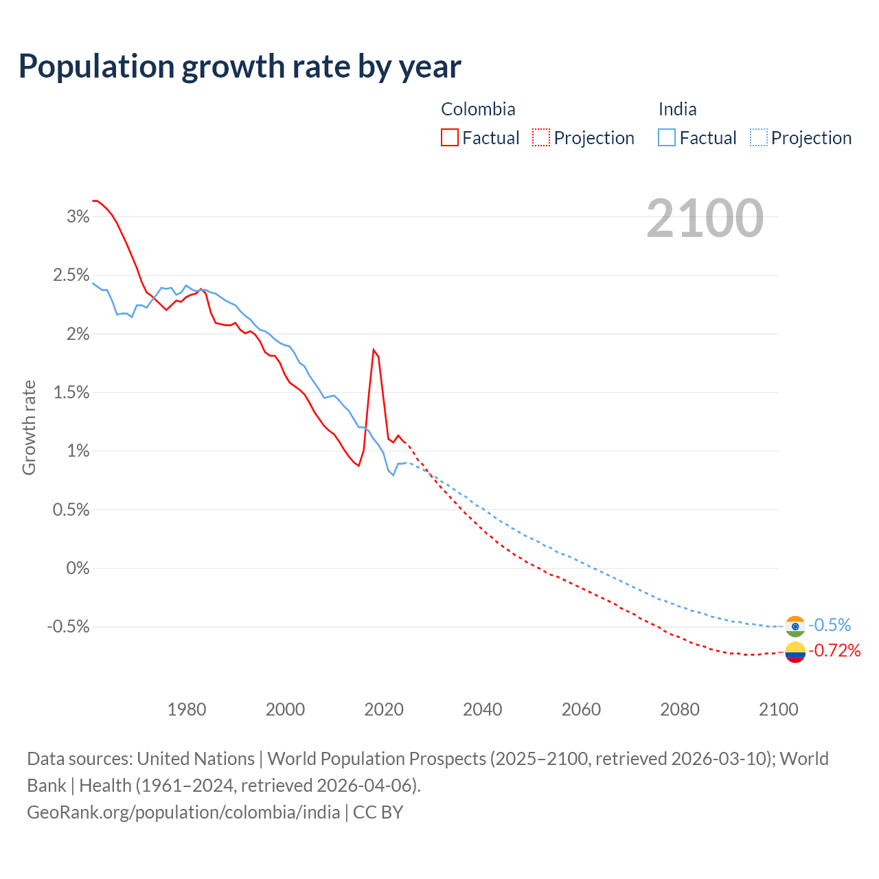 - For the last 10 years, Colombia has had an average growth rate of +1.25% per year vs +1.03% in India.