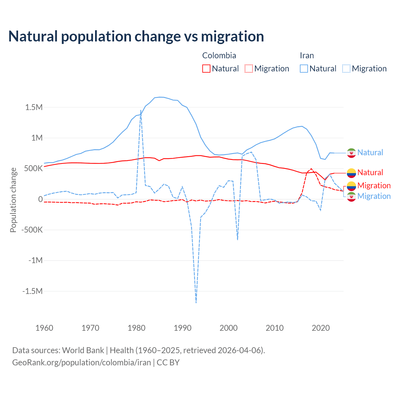 Over the last 10 years, 66.6% of the population change in Colombia is from natural causes (a gain of 4,162,856 people) and 33.4% is from migration (a gain of 2,083,051 people). In Iran 92.5% is from natural causes (a gain of 9,405,860 people) and 7.46% is from migration (a gain of 757,979 people).