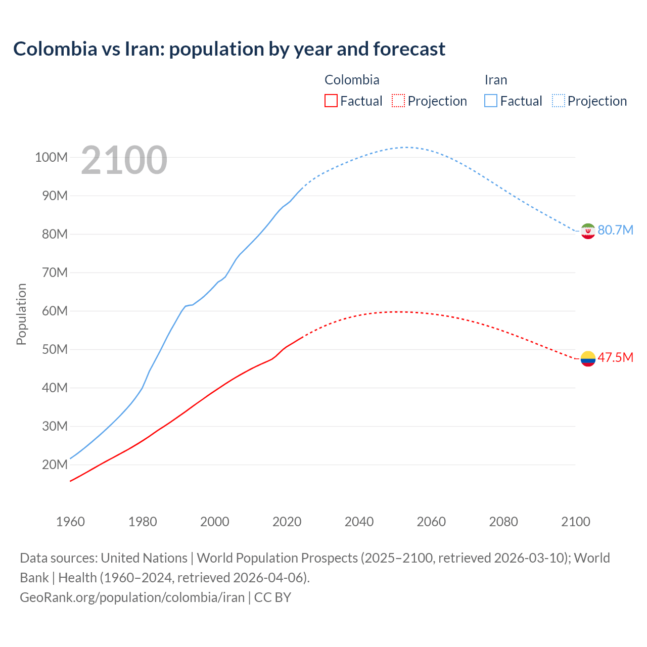 Colombia vs Iran: population by year and forecast