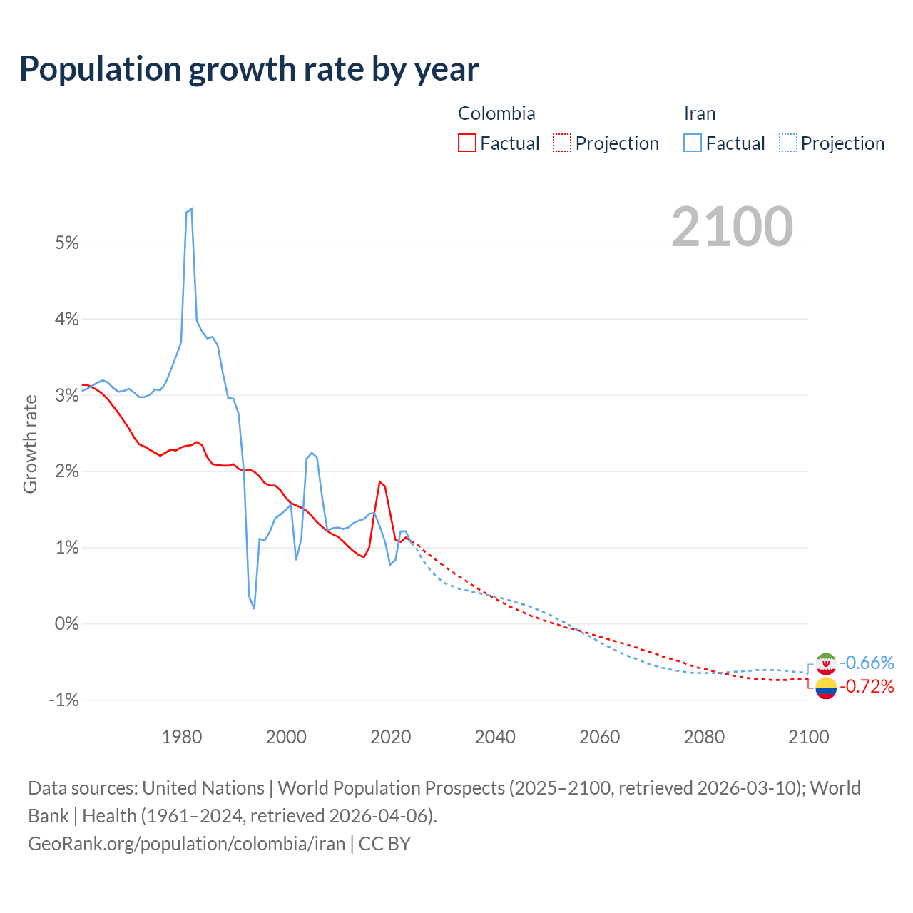 - For the last 10 years, Colombia has had an average growth rate of +1.25% per year vs +1.19% in Iran.