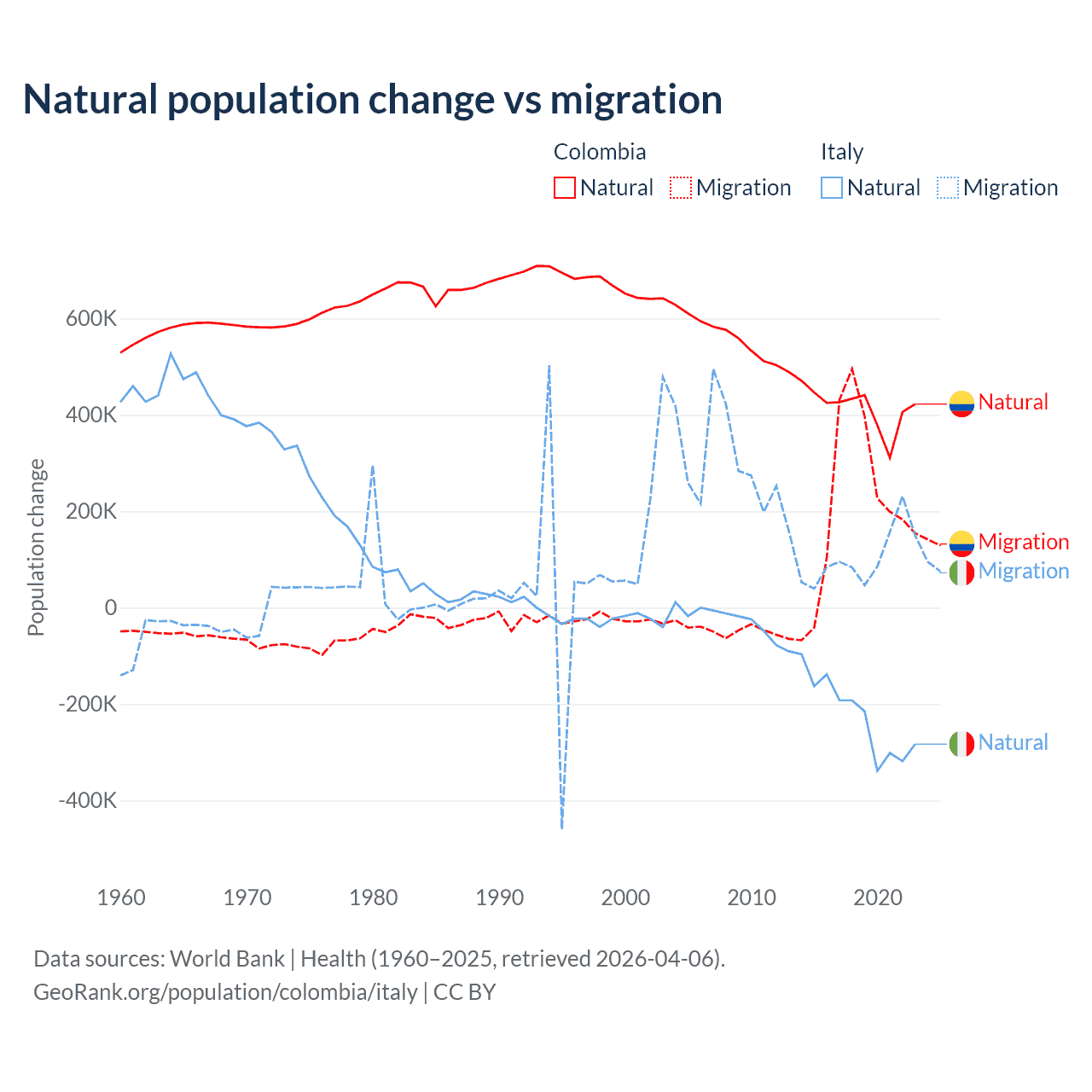Over the last 10 years, 66.6% of the population change in Colombia is from natural causes (a gain of 4,162,856 people) and 33.4% is from migration (a gain of 2,083,051 people). In Italy 68.6% is from natural causes (a loss of 2,239,084 people) and 31.4% is from migration (a gain of 1,026,128 people).