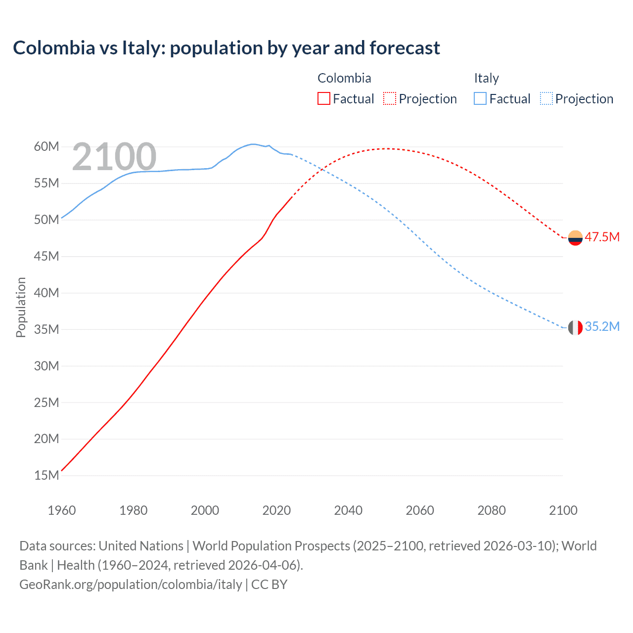 The latest officially reported population of Colombia was 52,886,363 in 2024 vs 58,952,704 people in Italy in 2024. In 2026, based on the adjusted UN estimation, the current Colombia's population is 54,105,437 people compared to 58,562,681 in Italy.