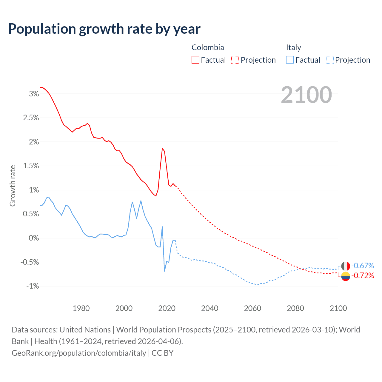 - For the last 10 years, Colombia has had an average growth rate of +1.25% per year vs -0.21% in Italy.