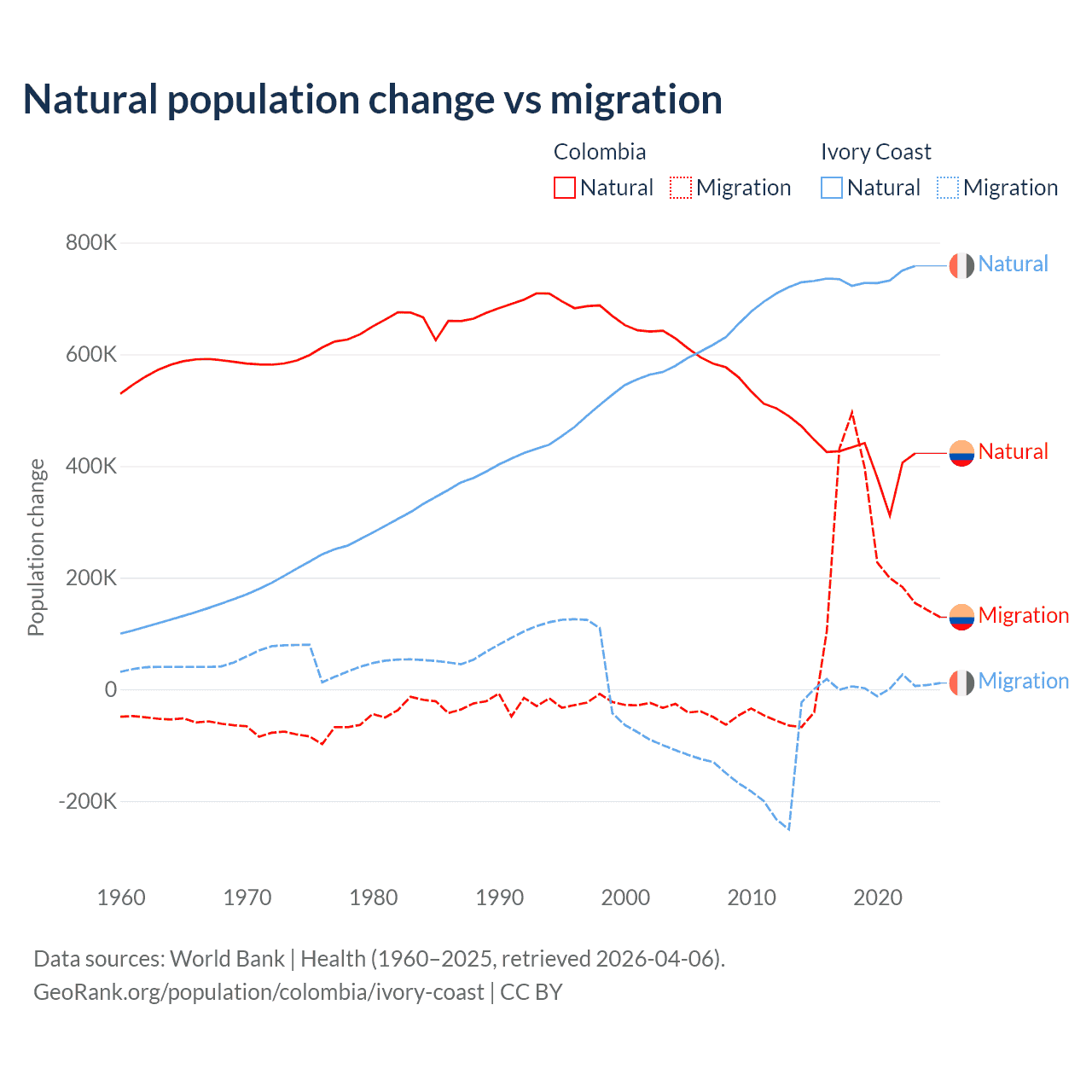 Over the last 10 years, 66.6% of the population change in Colombia is from natural causes (a gain of 4,162,856 people) and 33.4% is from migration (a gain of 2,083,051 people). In Ivory Coast 99.7% is from natural causes (a gain of 7,348,944 people) and 0.33% is from migration (a gain of 24,432 people).