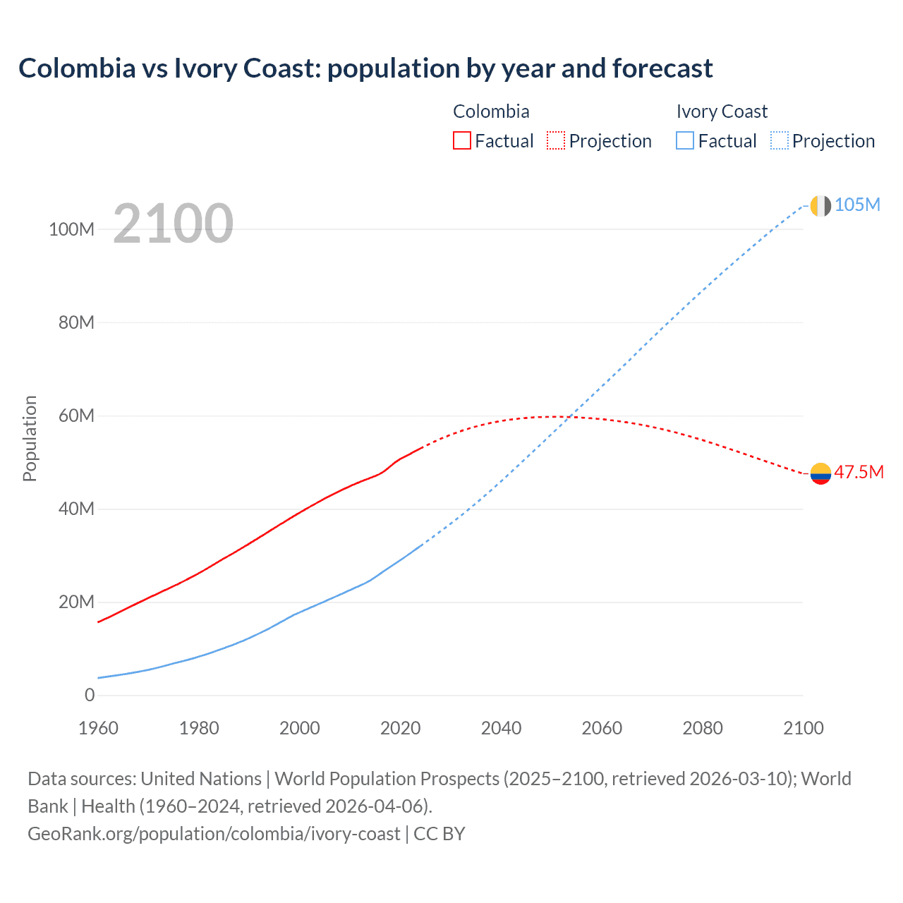 The latest officially reported population of Colombia was 52,886,363 in 2024 vs 31,934,230 people in Ivory Coast in 2024. In 2026, based on the adjusted UN estimation, the current Colombia's population is 54,105,437 people compared to 33,722,528 in Ivory Coast.