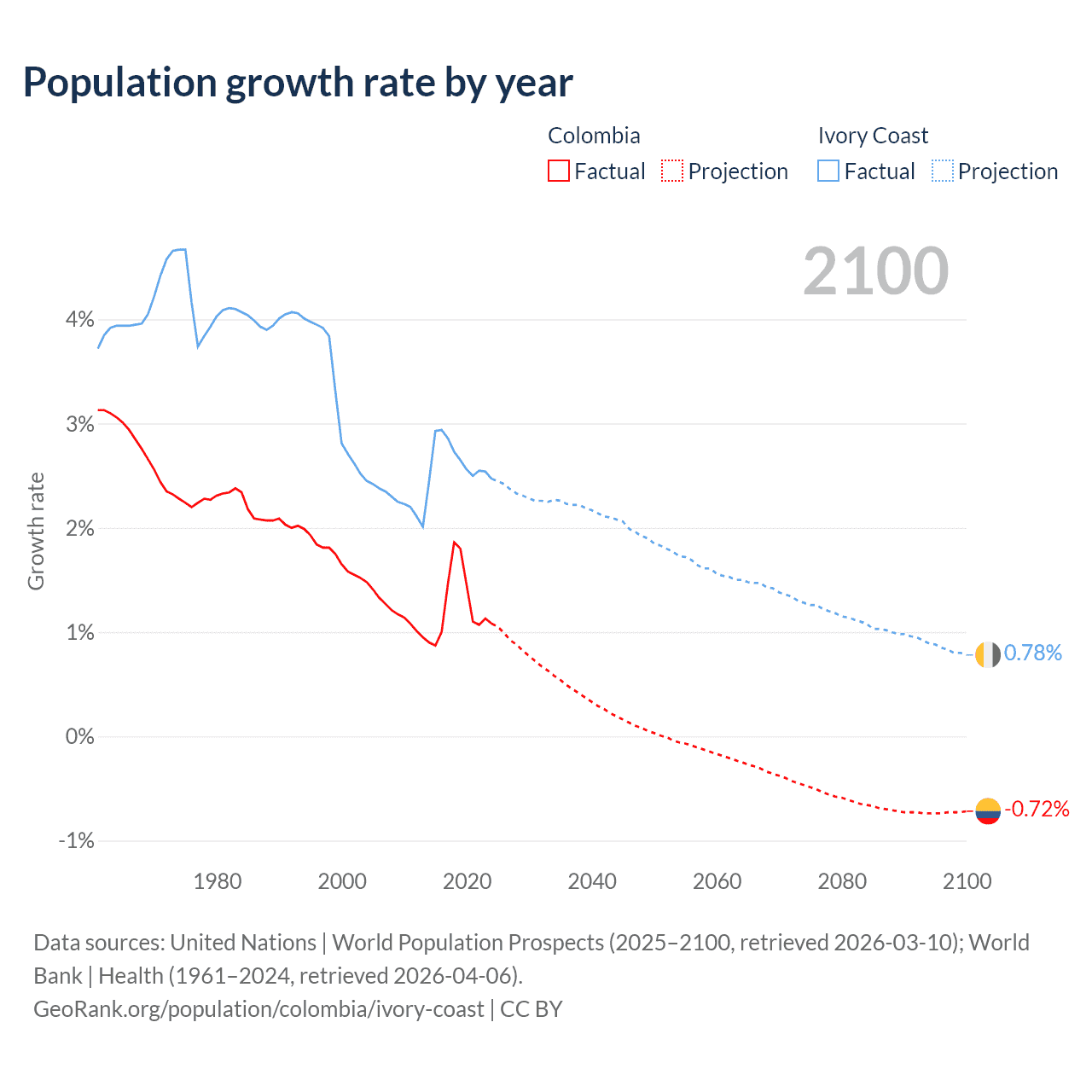 - For the last 10 years, Colombia has had an average growth rate of +1.25% per year vs +2.65% in Ivory Coast.
