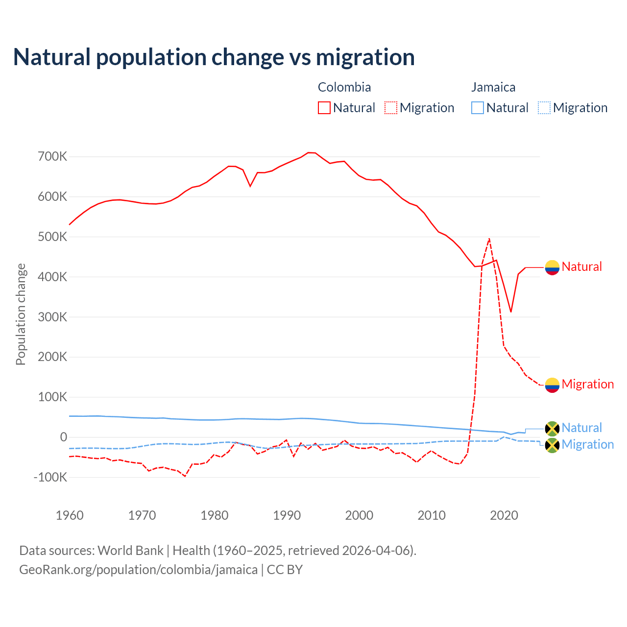 Over the last 10 years, 66.6% of the population change in Colombia is from natural causes (a gain of 4,162,856 people) and 33.4% is from migration (a gain of 2,083,051 people). In Jamaica 61.3% is from natural causes (a gain of 137,465 people) and 38.7% is from migration (a loss of 86,681 people).