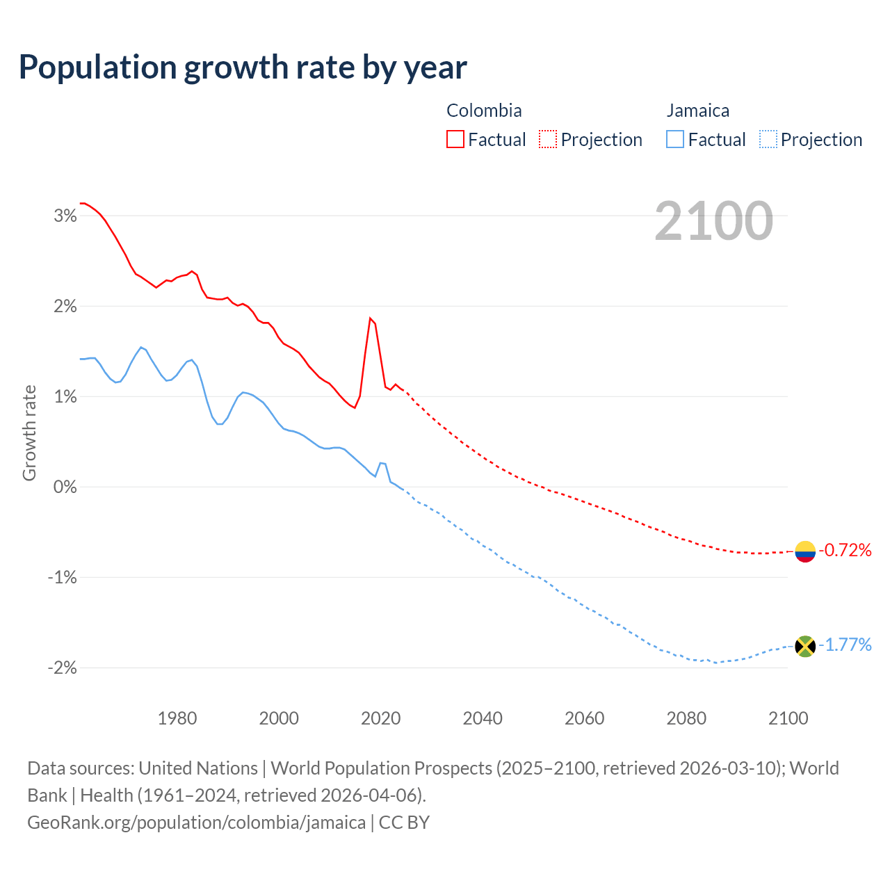 - For the last 10 years, Colombia has had an average growth rate of +1.25% per year vs +0.18% in Jamaica.