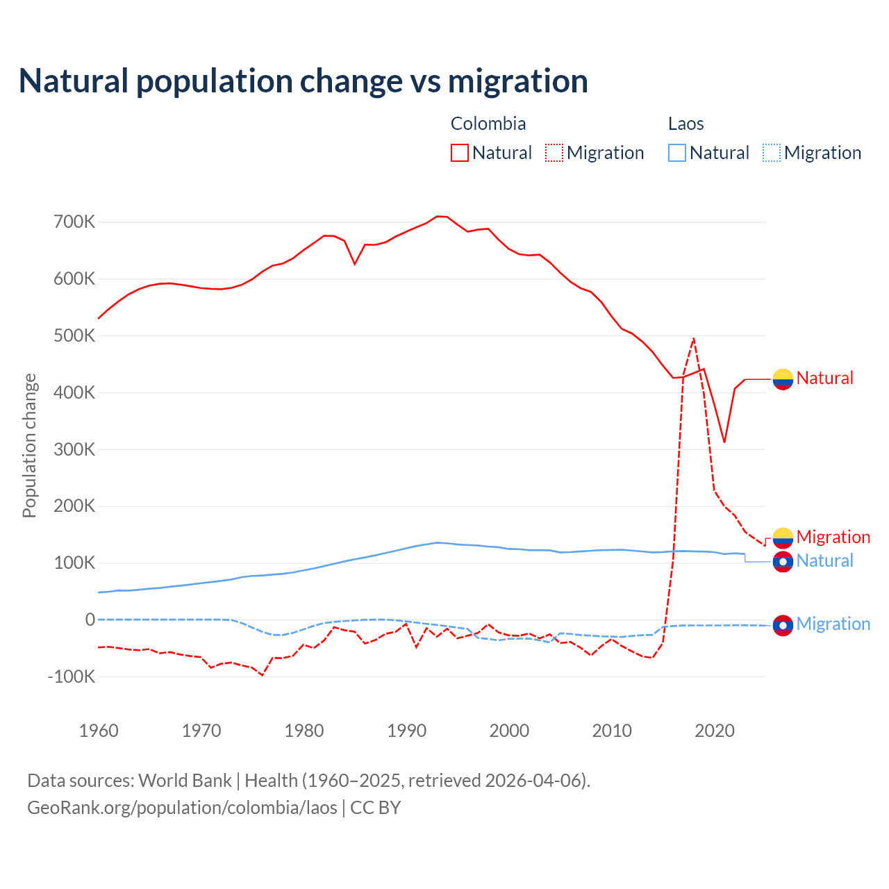Over the last 10 years, 66.6% of the population change in Colombia is from natural causes (a gain of 4,162,856 people) and 33.4% is from migration (a gain of 2,083,051 people). In Laos 90.6% is from natural causes (a gain of 1,183,013 people) and 9.41% is from migration (a loss of 122,899 people).