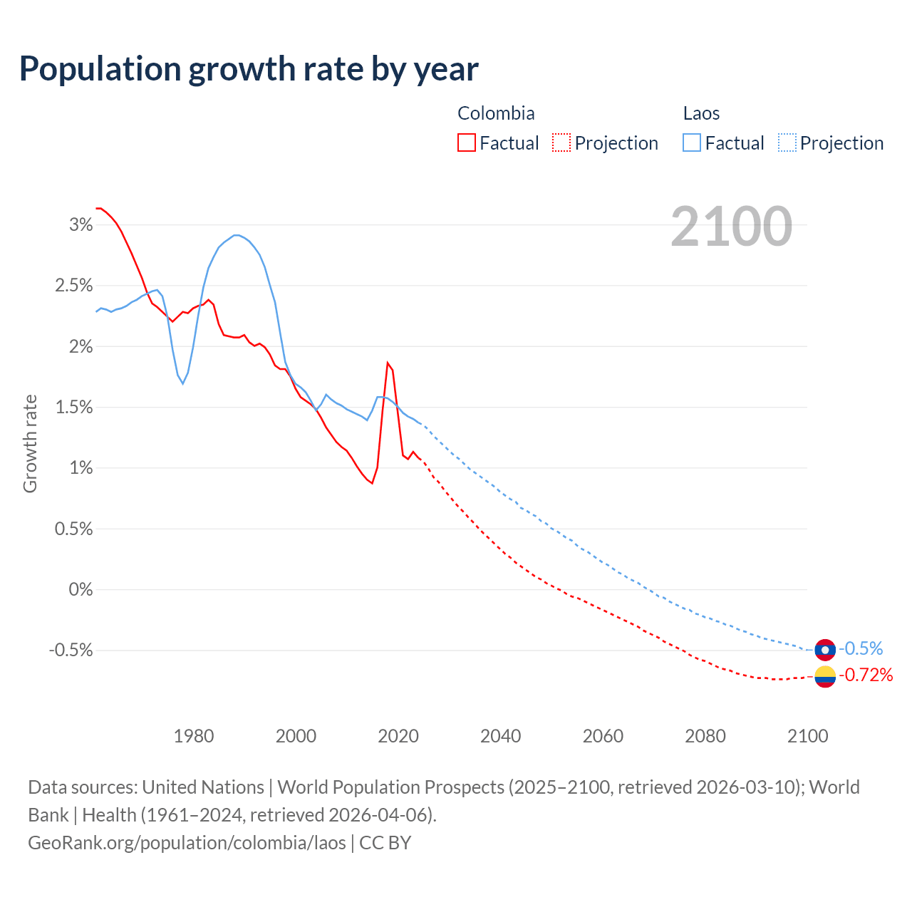 - For the last 10 years, Colombia has had an average growth rate of +1.25% per year vs +1.48% in Laos.