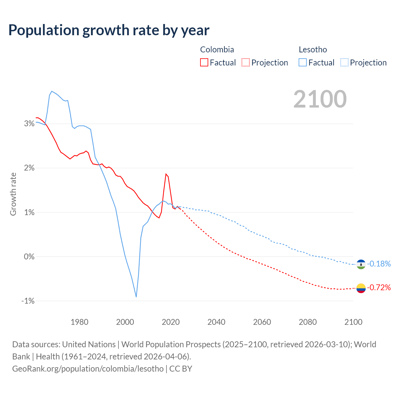 - For the last 10 years, Colombia has had an average growth rate of +1.25% per year vs +1.17% in Lesotho.