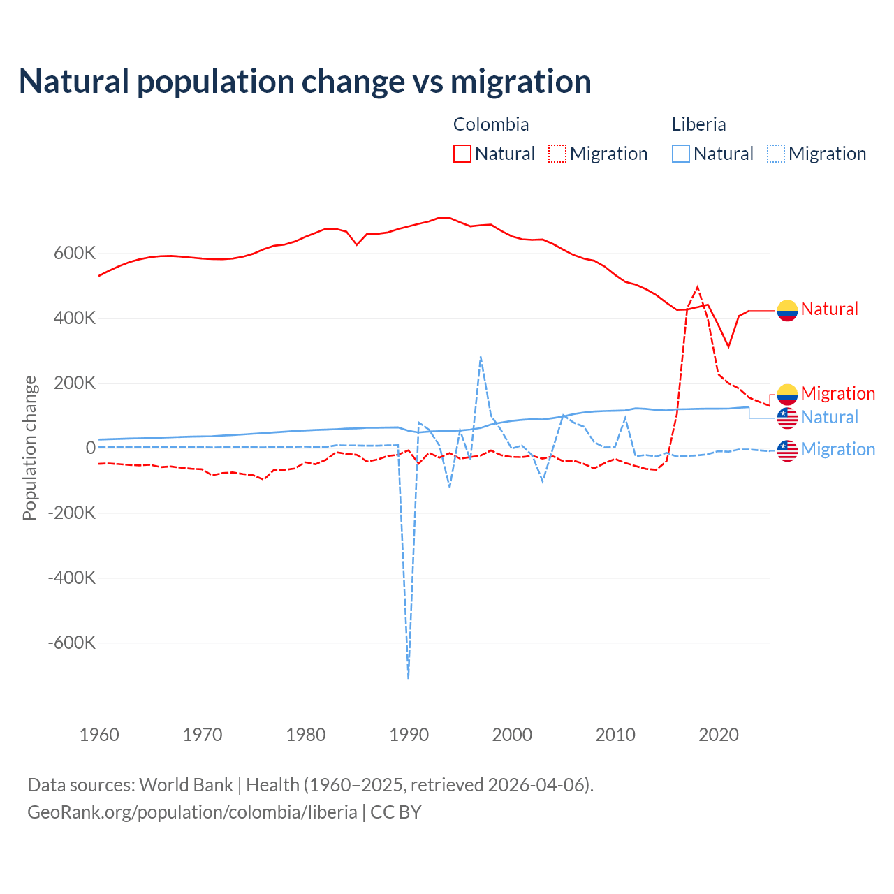 Over the last 10 years, 66.6% of the population change in Colombia is from natural causes (a gain of 4,162,856 people) and 33.4% is from migration (a gain of 2,083,051 people). In Liberia 87.7% is from natural causes (a gain of 1,202,387 people) and 12.3% is from migration (a loss of 168,316 people).