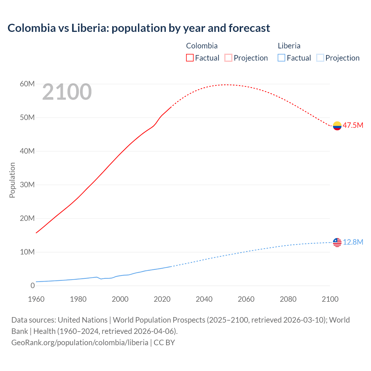 Colombia vs Liberia: population by year and forecast