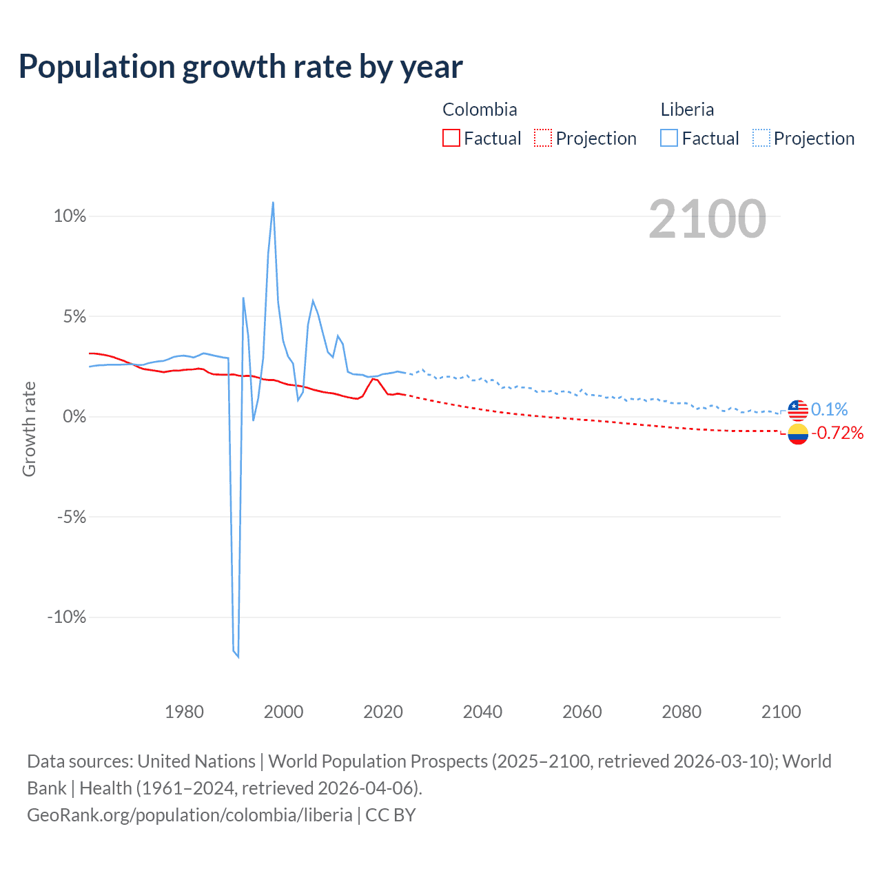 - For the last 10 years, Colombia has had an average growth rate of +1.25% per year vs +2.09% in Liberia.
