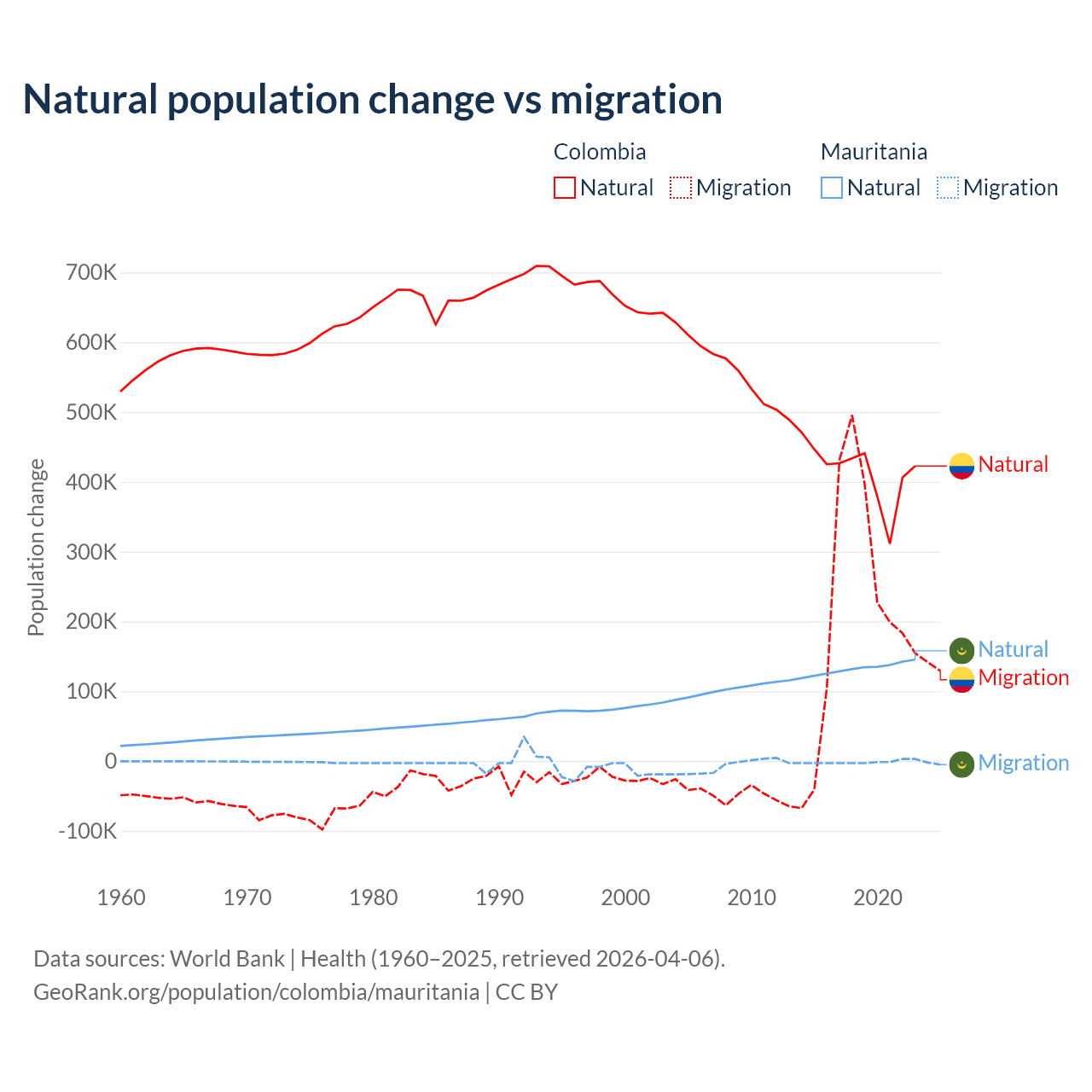 Over the last 10 years, 66.6% of the population change in Colombia is from natural causes (a gain of 4,162,856 people) and 33.4% is from migration (a gain of 2,083,051 people). In Mauritania 98.9% is from natural causes (a gain of 1,320,903 people) and 1.12% is from migration (a loss of 14,982 people).