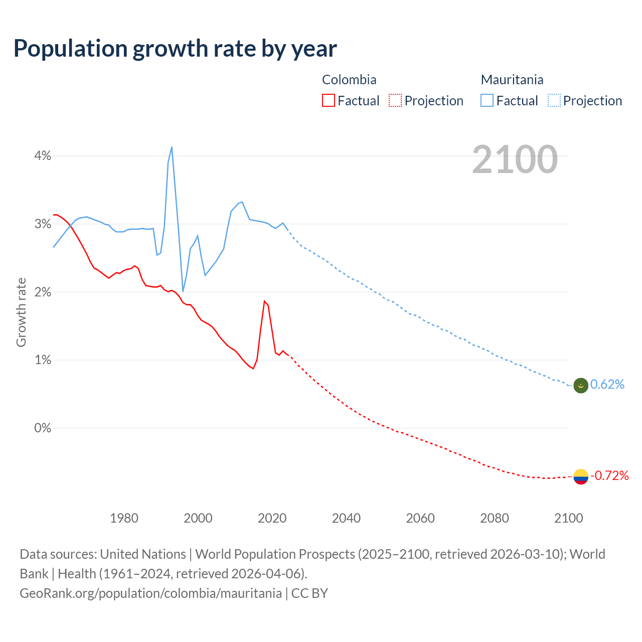 - For the last 10 years, Colombia has had an average growth rate of +1.25% per year vs +3% in Mauritania.