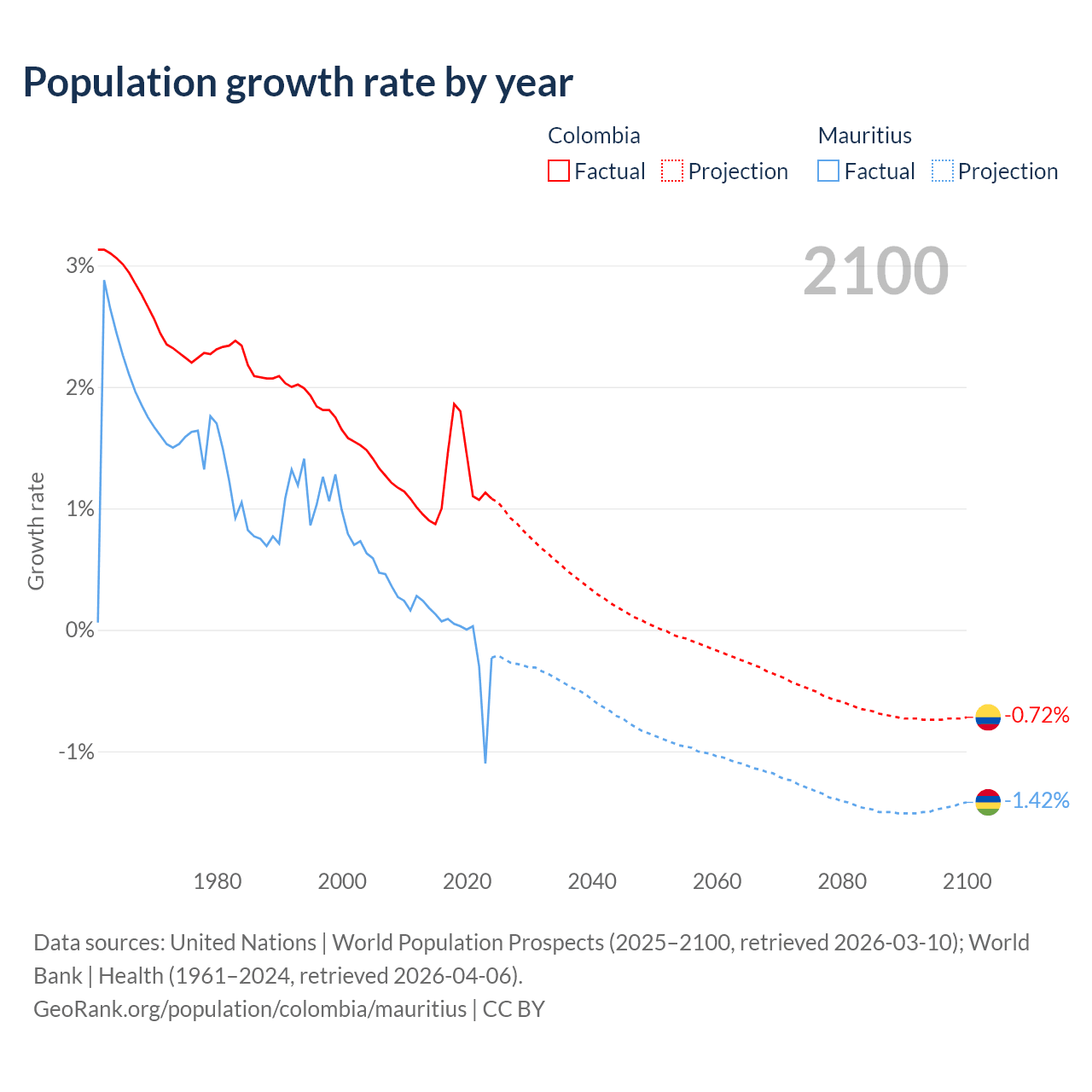 - For the last 10 years, Colombia has had an average growth rate of +1.25% per year vs -0.09% in Mauritius.