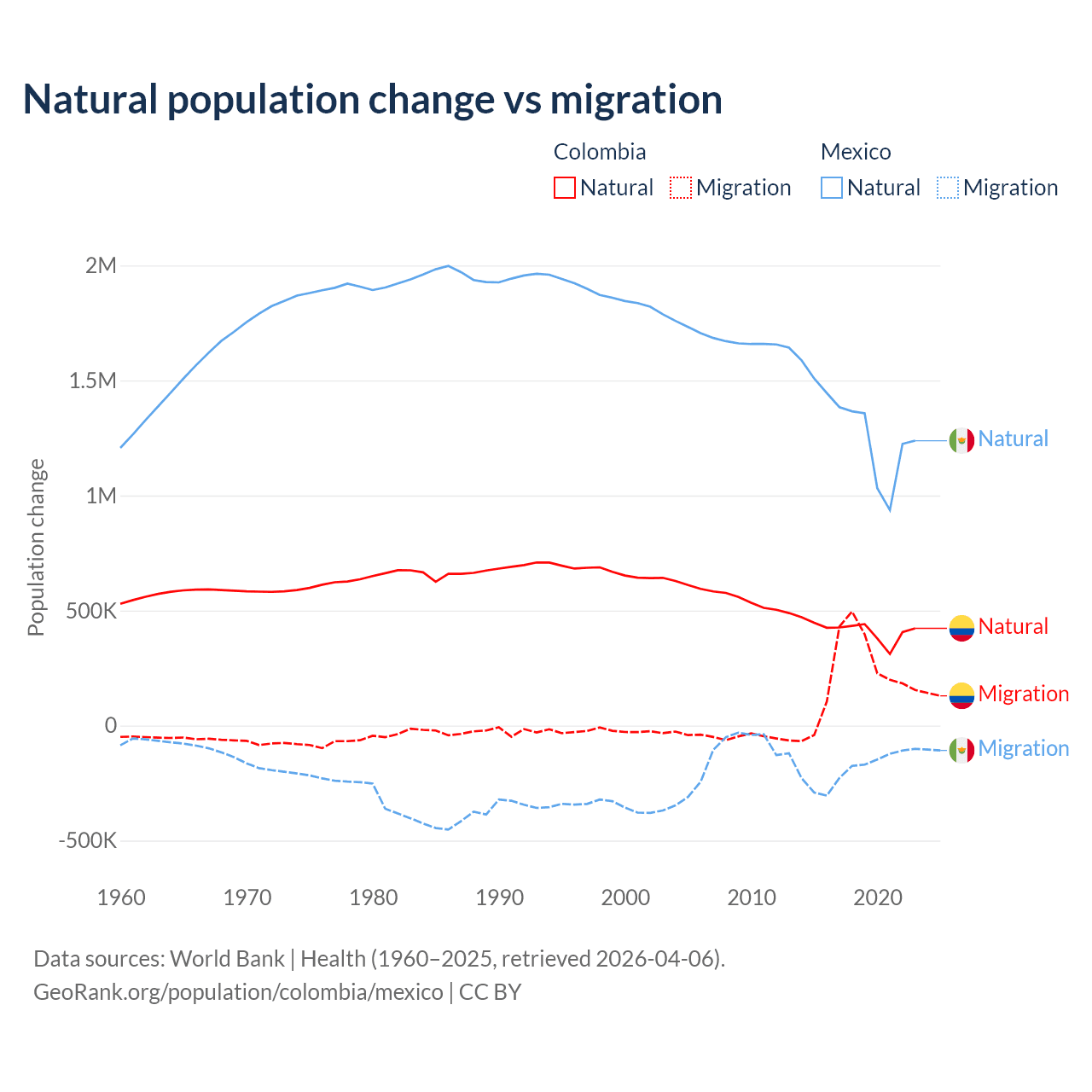 Over the last 10 years, 66.6% of the population change in Colombia is from natural causes (a gain of 4,162,856 people) and 33.4% is from migration (a gain of 2,083,051 people). In Mexico 87.5% is from natural causes (a gain of 13,080,136 people) and 12.5% is from migration (a loss of 1,876,544 people).