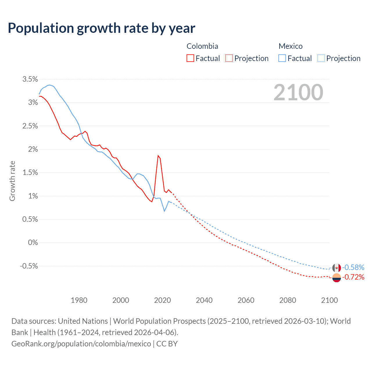 - For the last 10 years, Colombia has had an average growth rate of +1.25% per year vs +0.92% in Mexico.