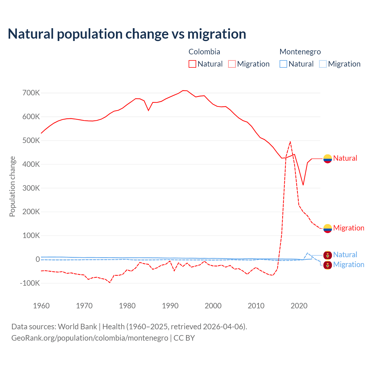 Over the last 10 years, 66.6% of the population change in Colombia is from natural causes (a gain of 4,162,856 people) and 33.4% is from migration (a gain of 2,083,051 people). In Montenegro 52.4% is from natural causes (a gain of 4,501 people) and 47.6% is from migration (a gain of 4,095 people).