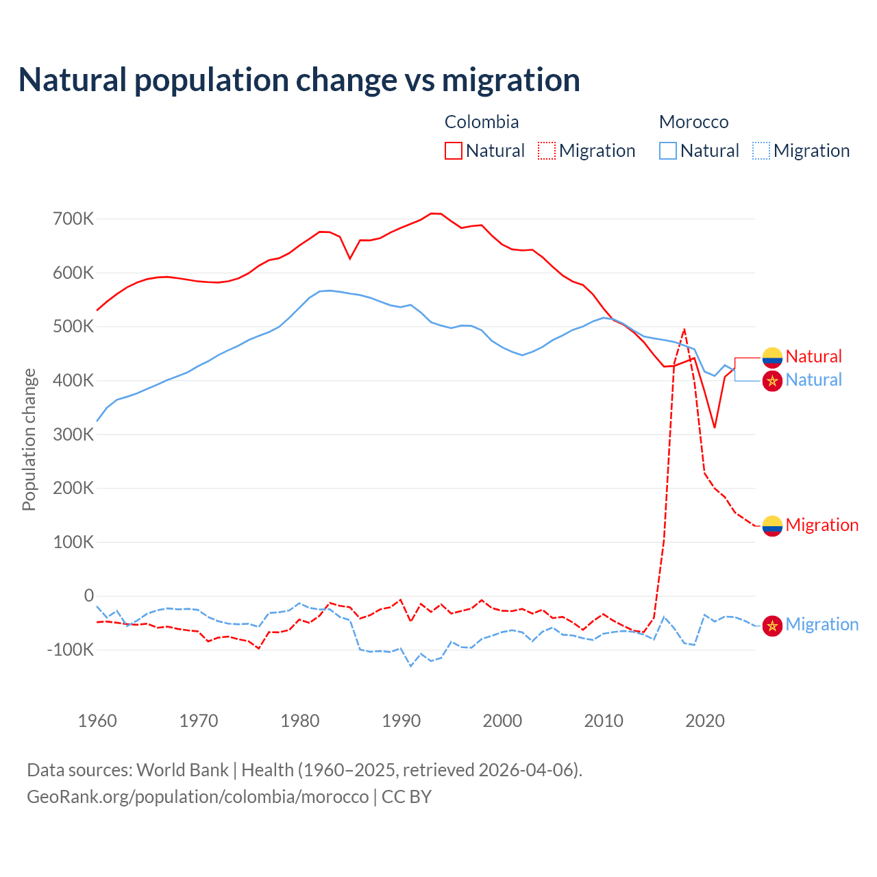 Over the last 10 years, 66.6% of the population change in Colombia is from natural causes (a gain of 4,162,856 people) and 33.4% is from migration (a gain of 2,083,051 people). In Morocco 88.3% is from natural causes (a gain of 4,495,223 people) and 11.7% is from migration (a loss of 594,083 people).