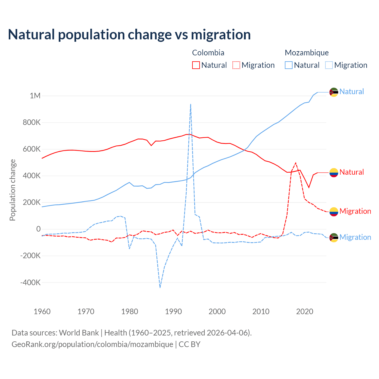 Over the last 10 years, 66.6% of the population change in Colombia is from natural causes (a gain of 4,162,856 people) and 33.4% is from migration (a gain of 2,083,051 people). In Mozambique 95.9% is from natural causes (a gain of 9,108,203 people) and 4.15% is from migration (a loss of 393,923 people).