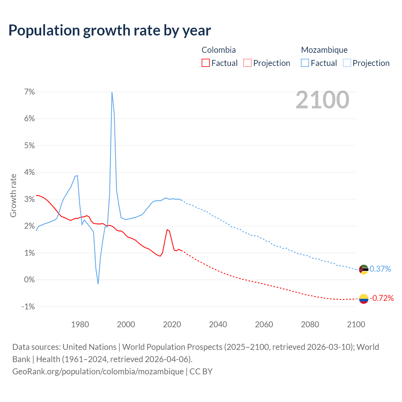 - For the last 10 years, Colombia has had an average growth rate of +1.25% per year vs +2.99% in Mozambique.
