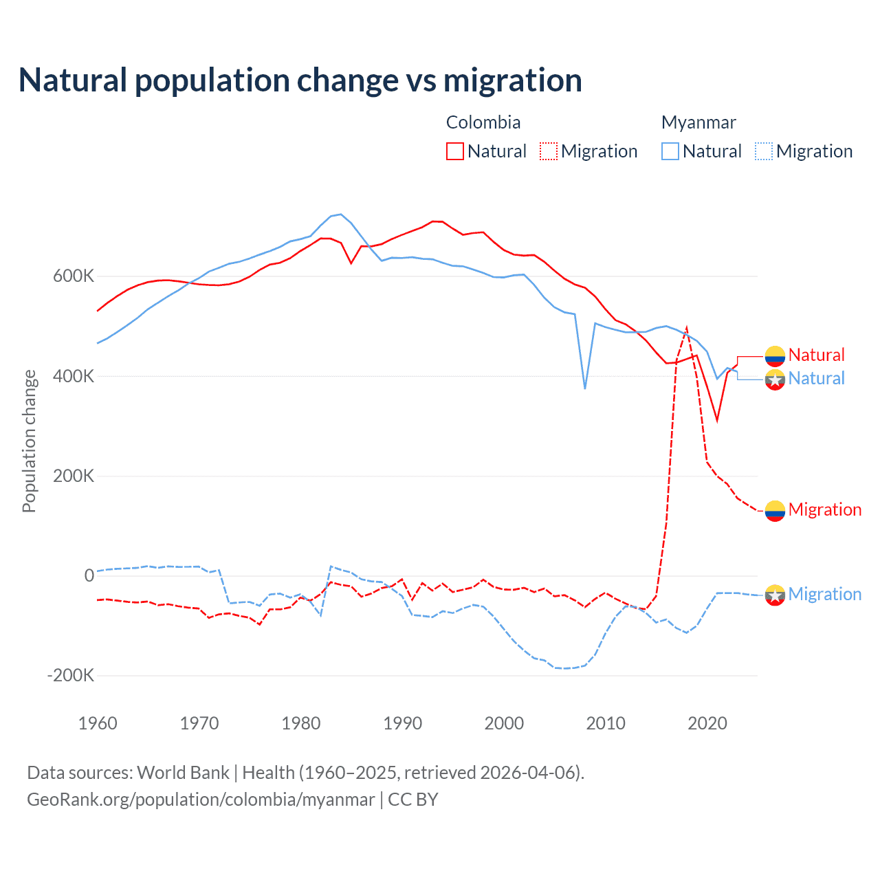 Over the last 10 years, 66.6% of the population change in Colombia is from natural causes (a gain of 4,162,856 people) and 33.4% is from migration (a gain of 2,083,051 people). In Myanmar 86% is from natural causes (a gain of 4,594,615 people) and 14% is from migration (a loss of 749,272 people).