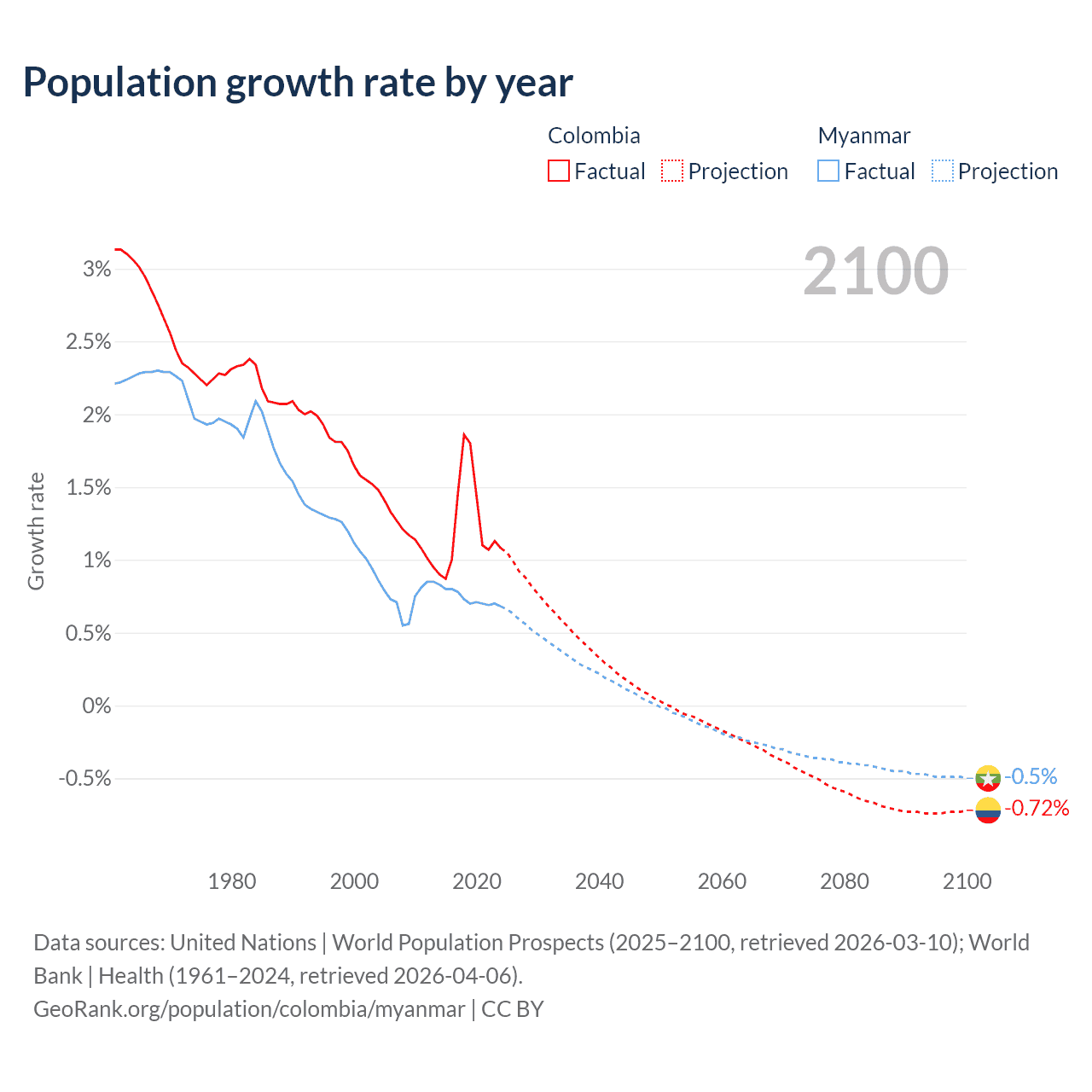 - For the last 10 years, Colombia has had an average growth rate of +1.25% per year vs +0.74% in Myanmar.