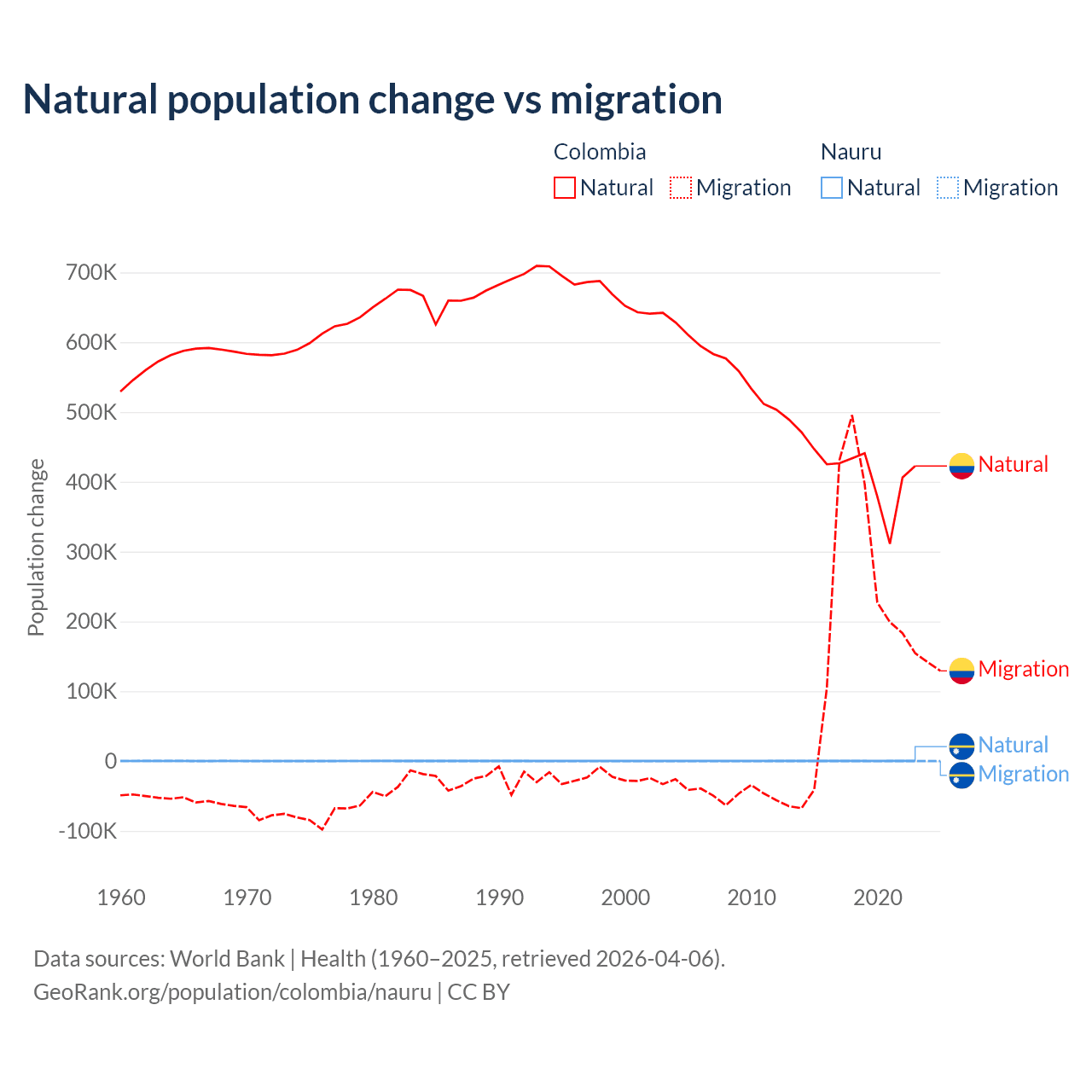 Over the last 10 years, 66.6% of the population change in Colombia is from natural causes (a gain of 4,162,856 people) and 33.4% is from migration (a gain of 2,083,051 people). In Nauru 66.2% is from natural causes (a gain of 2,590 people) and 33.8% is from migration (a loss of 1,320 people).