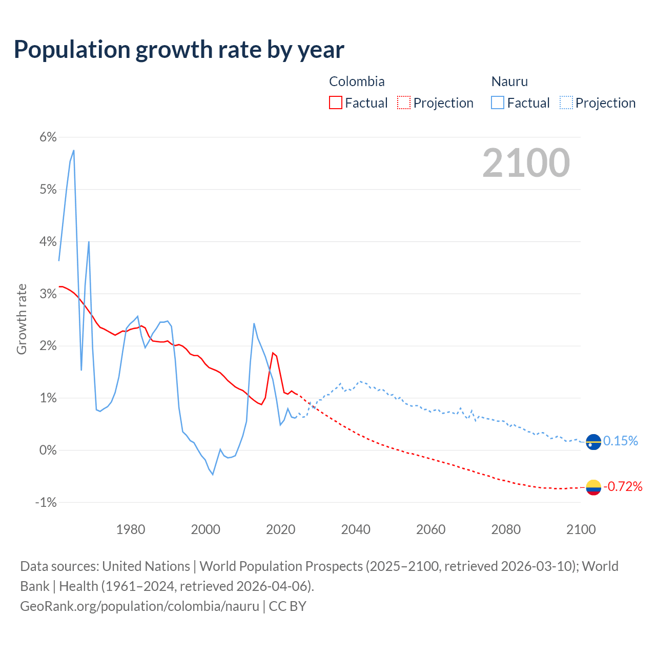 - For the last 10 years, Colombia has had an average growth rate of +1.25% per year vs +1.17% in Nauru.