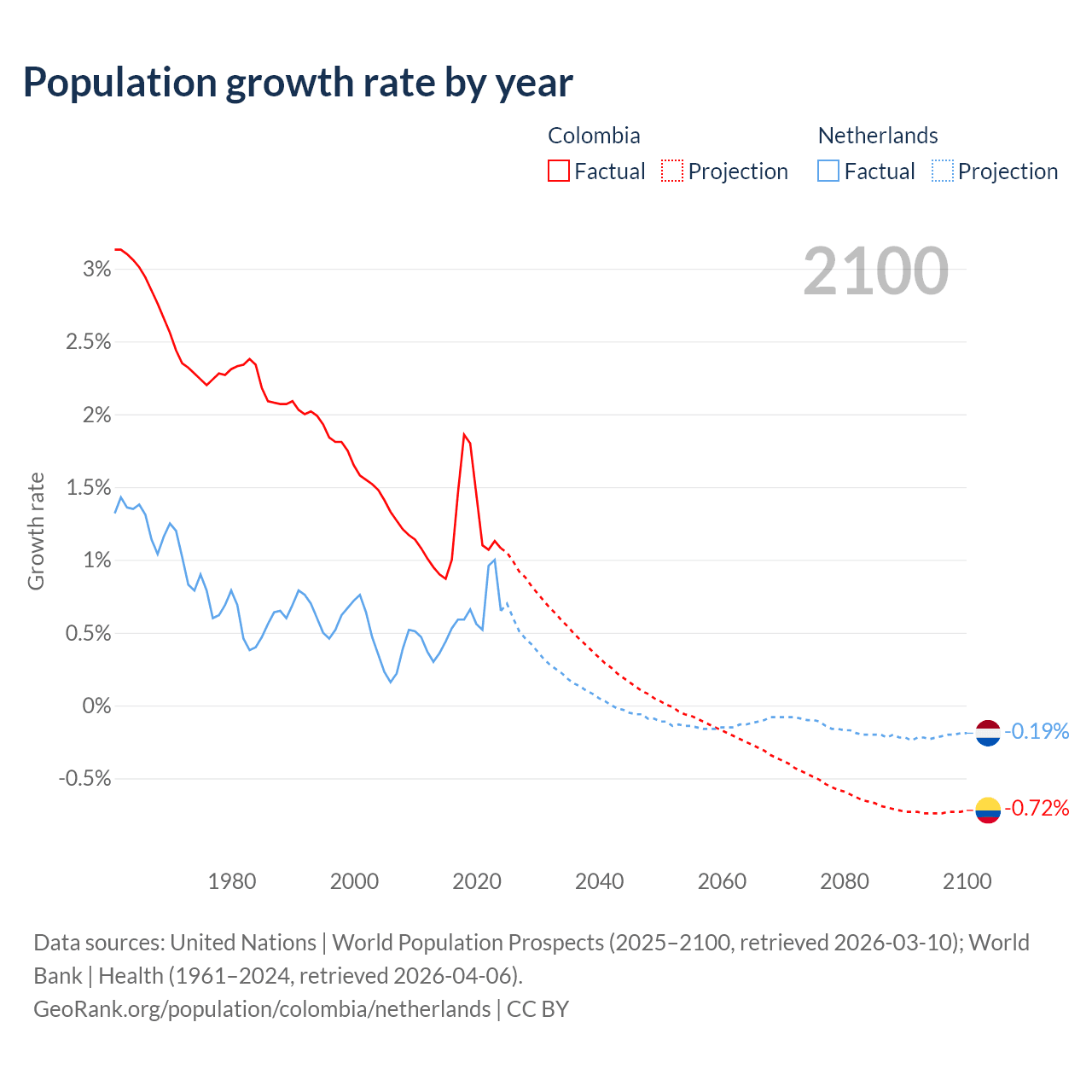 - For the last 10 years, Colombia has had an average growth rate of +1.25% per year vs +0.62% in the Netherlands.