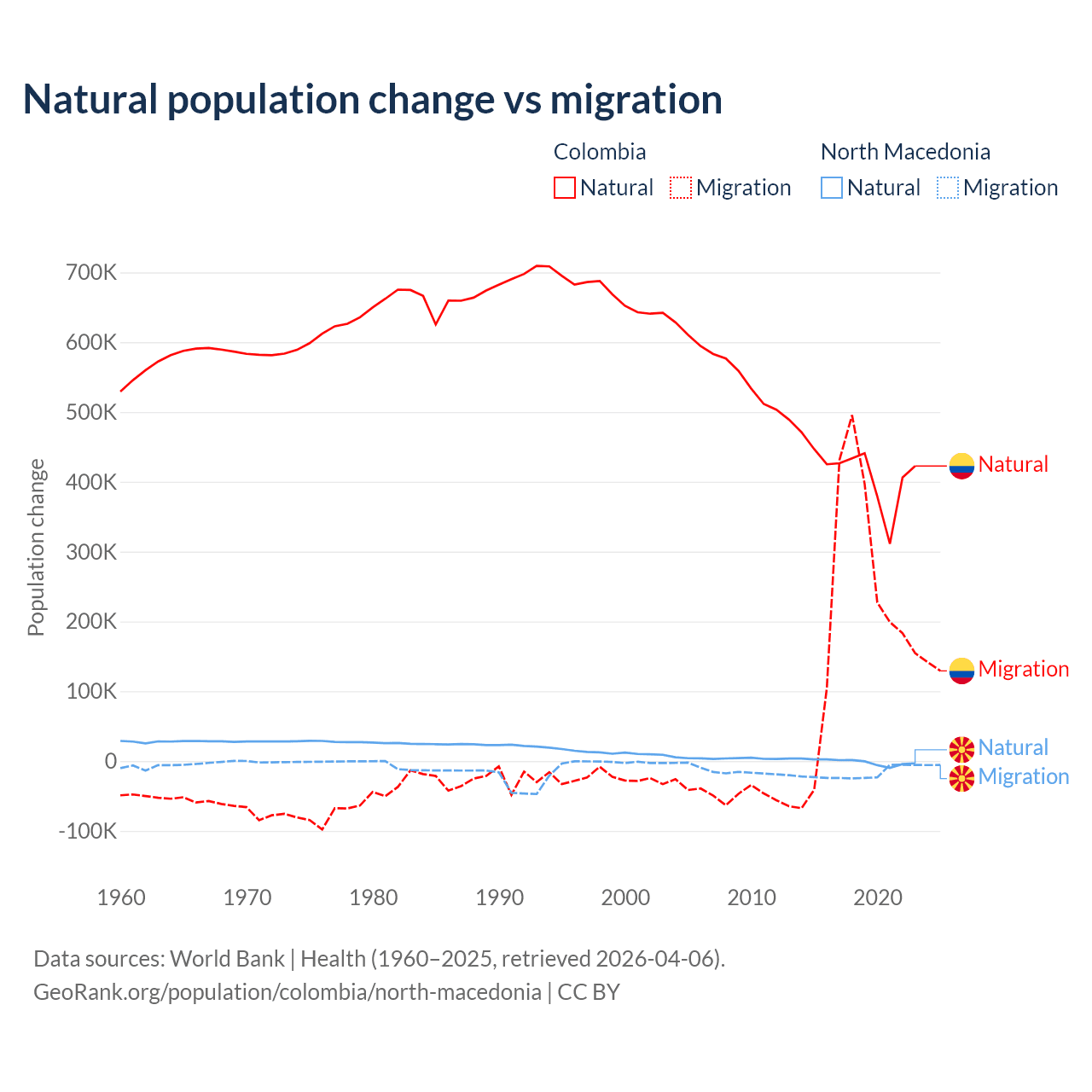 Over the last 10 years, 66.6% of the population change in Colombia is from natural causes (a gain of 4,162,856 people) and 33.4% is from migration (a gain of 2,083,051 people). In North Macedonia 6.45% is from natural causes (a loss of 12,585 people) and 93.5% is from migration (a loss of 182,429 people).