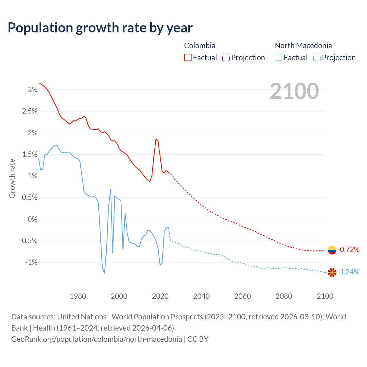 - For the last 10 years, Colombia has had an average growth rate of +1.25% per year vs -0.48% in North Macedonia.