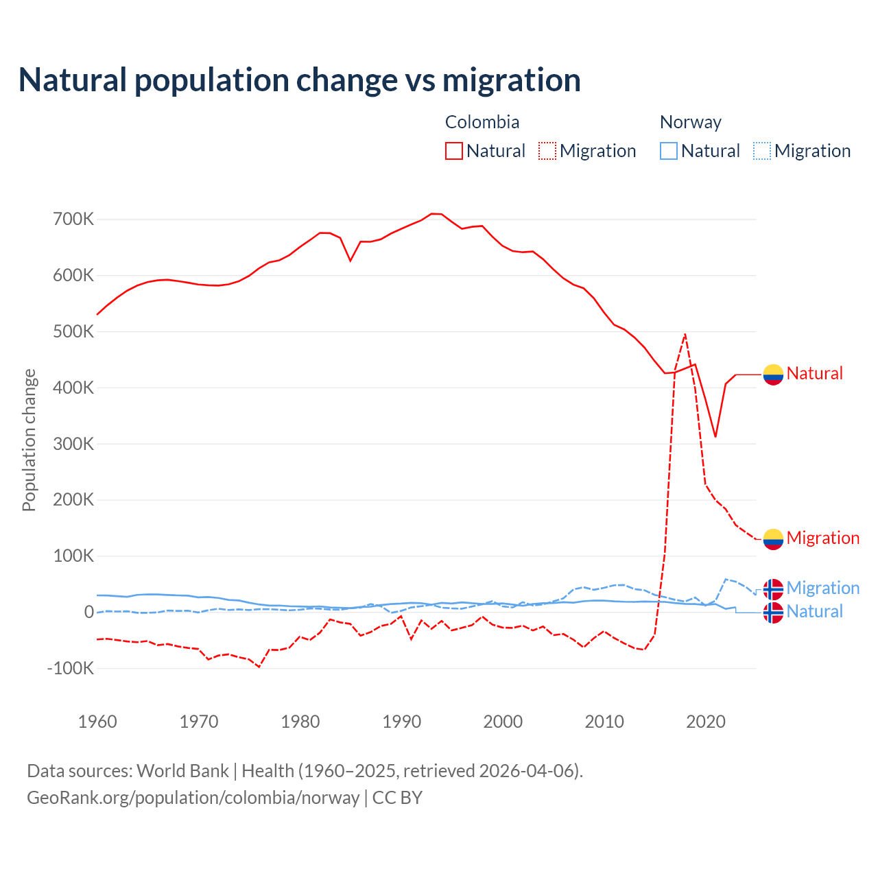 Over the last 10 years, 66.6% of the population change in Colombia is from natural causes (a gain of 4,162,856 people) and 33.4% is from migration (a gain of 2,083,051 people). In Norway 31.3% is from natural causes (a gain of 138,699 people) and 68.7% is from migration (a gain of 303,945 people).