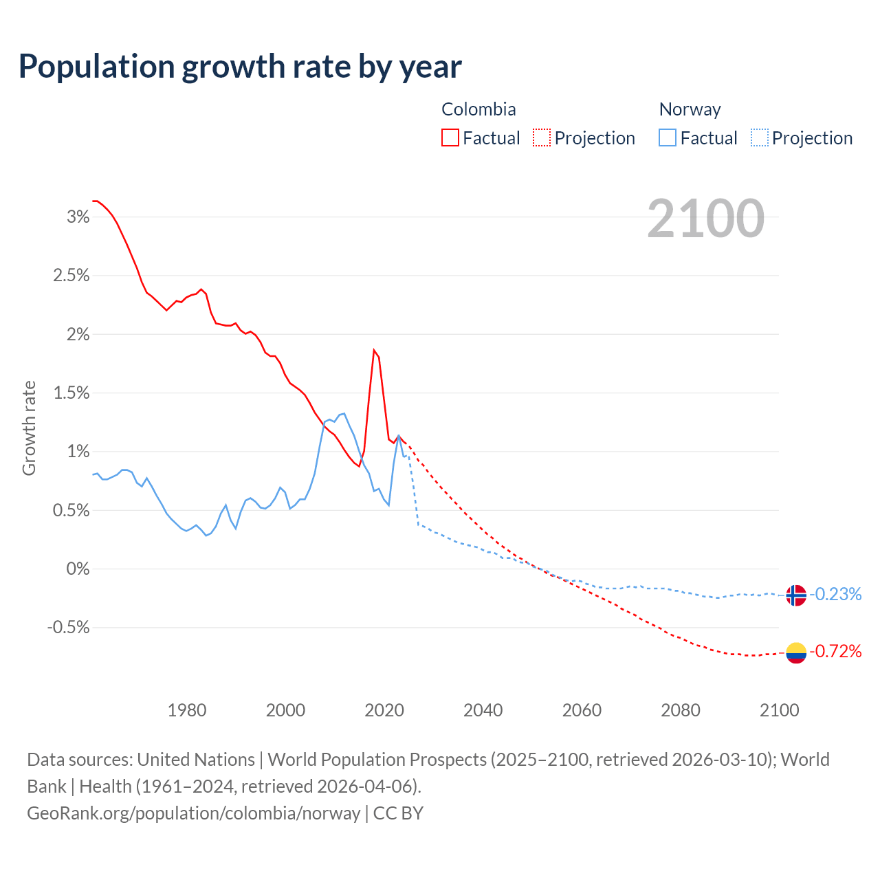 - For the last 10 years, Colombia has had an average growth rate of +1.25% per year vs +0.85% in Norway.