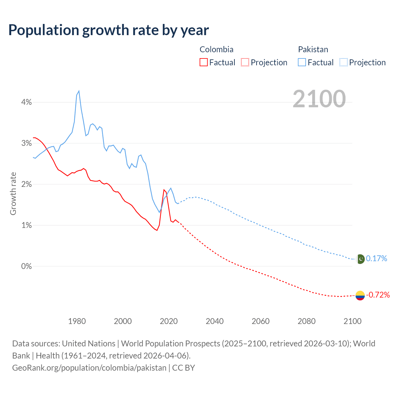 - For the last 10 years, Colombia has had an average growth rate of +1.25% per year vs +1.6% in Pakistan.