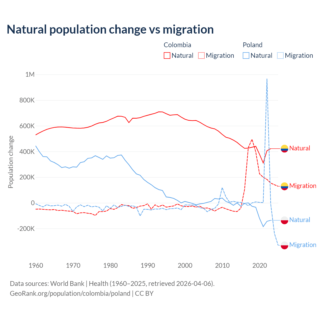 Over the last 10 years, 66.6% of the population change in Colombia is from natural causes (a gain of 4,162,856 people) and 33.4% is from migration (a gain of 2,083,051 people). In Poland 41.4% is from natural causes (a loss of 675,443 people) and 58.6% is from migration (a gain of 955,766 people).