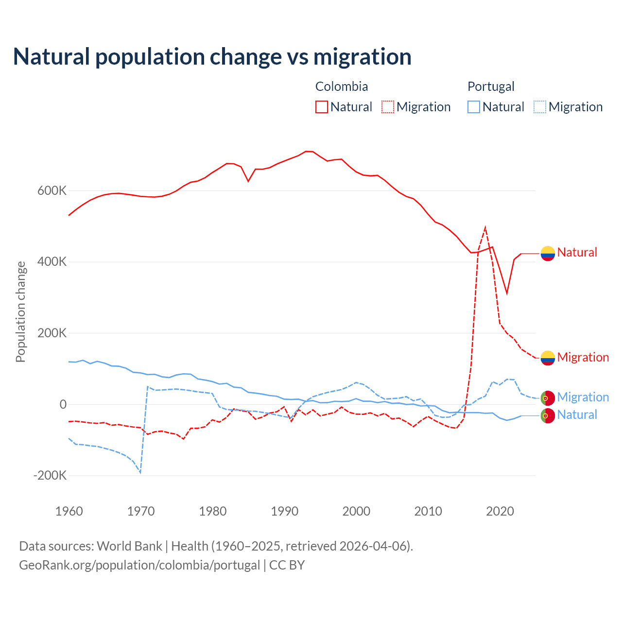 Over the last 10 years, 66.6% of the population change in Colombia is from natural causes (a gain of 4,162,856 people) and 33.4% is from migration (a gain of 2,083,051 people). In Portugal 51% is from natural causes (a loss of 302,748 people) and 49% is from migration (a gain of 290,554 people).