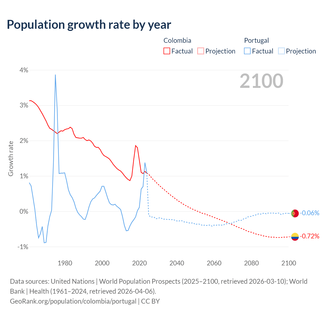 - For the last 10 years, Colombia has had an average growth rate of +1.25% per year vs +0.21% in Portugal.