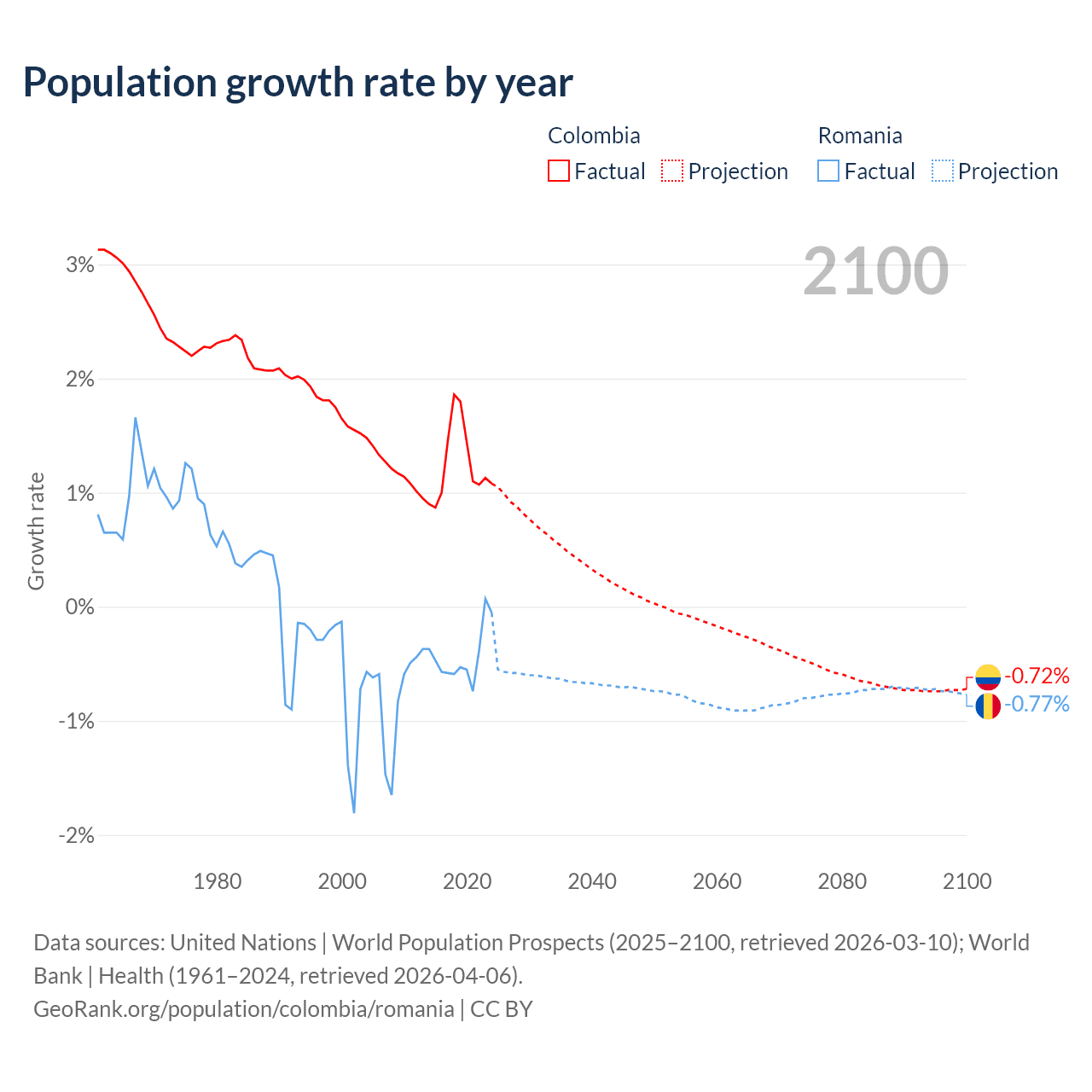 - For the last 10 years, Colombia has had an average growth rate of +1.25% per year vs -0.43% in Romania.