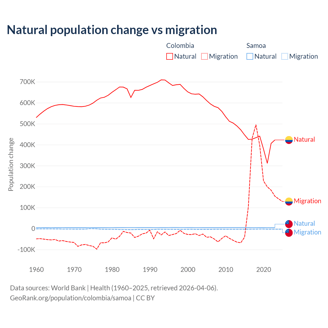 Over the last 10 years, 66.6% of the population change in Colombia is from natural causes (a gain of 4,162,856 people) and 33.4% is from migration (a gain of 2,083,051 people). In Samoa 62.5% is from natural causes (a gain of 45,436 people) and 37.5% is from migration (a loss of 27,246 people).