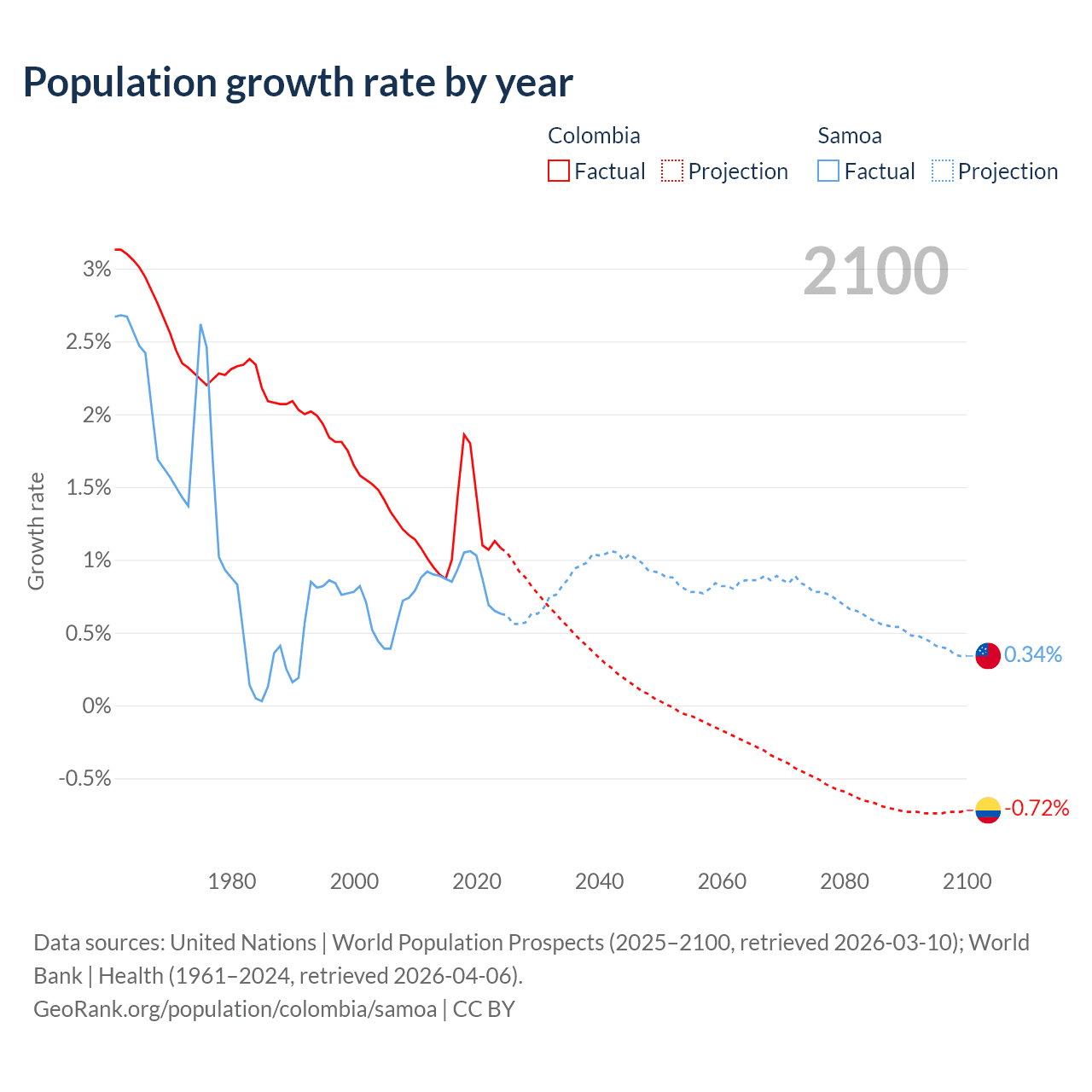 - For the last 10 years, Colombia has had an average growth rate of +1.25% per year vs +0.87% in Samoa.