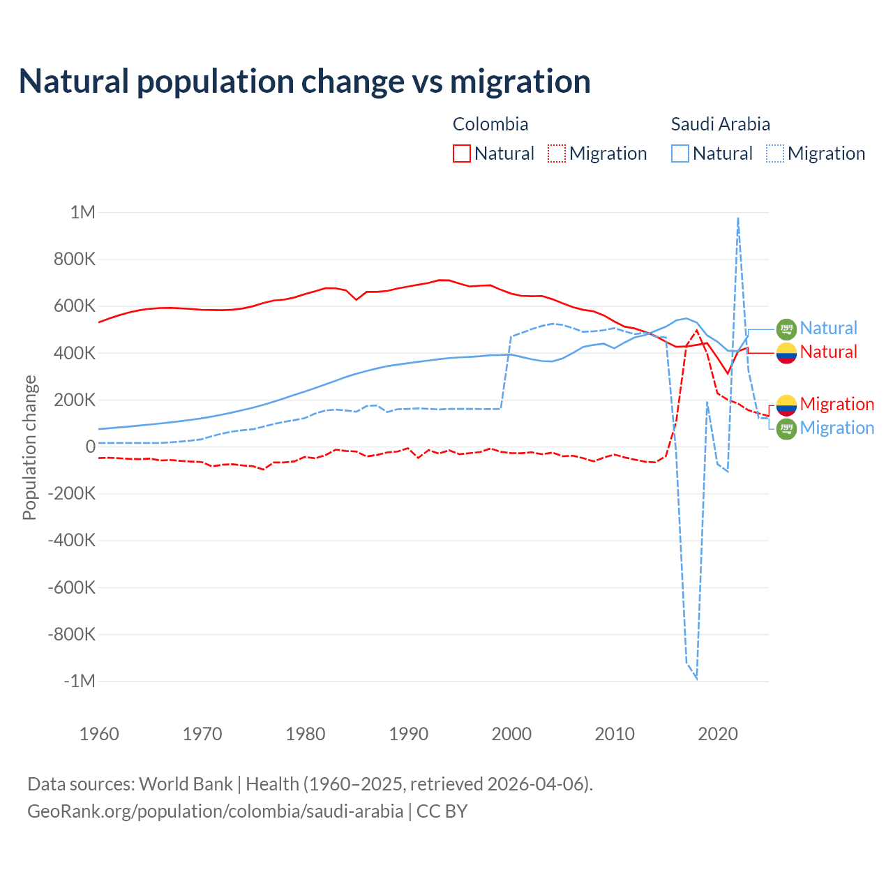 Over the last 10 years, 66.6% of the population change in Colombia is from natural causes (a gain of 4,162,856 people) and 33.4% is from migration (a gain of 2,083,051 people). In Saudi Arabia 93.9% is from natural causes (a gain of 4,829,562 people) and 6.05% is from migration (a gain of 311,209 people).