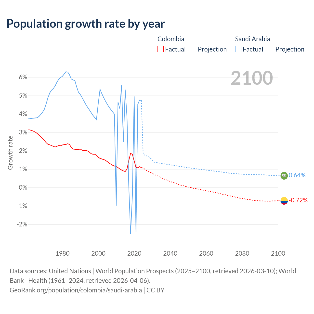 - For the last 10 years, Colombia has had an average growth rate of +1.25% per year vs +2.3% in Saudi Arabia.