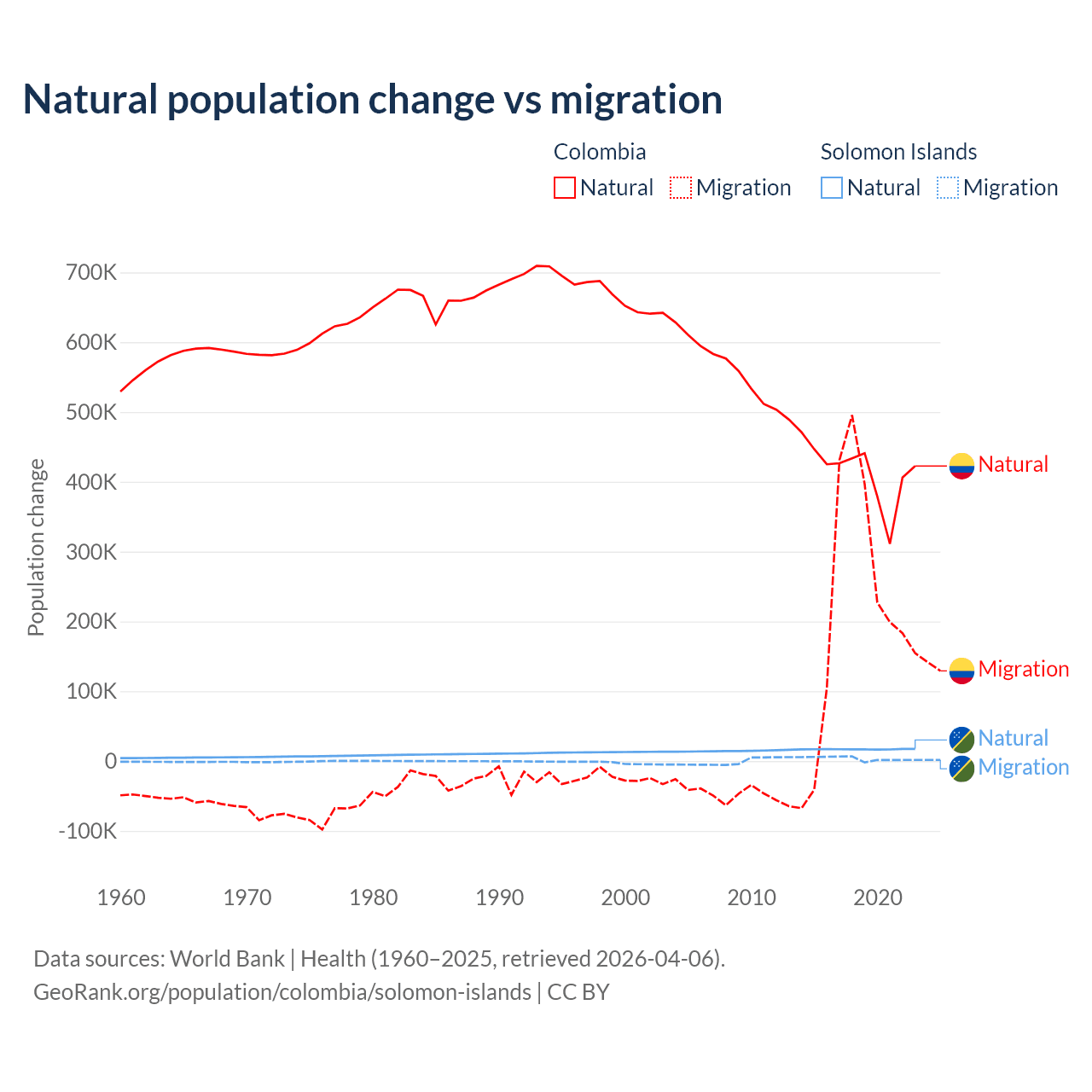 Over the last 10 years, 66.6% of the population change in Colombia is from natural causes (a gain of 4,162,856 people) and 33.4% is from migration (a gain of 2,083,051 people). In the Solomon Islands 82.8% is from natural causes (a gain of 168,727 people) and 17.2% is from migration (a gain of 35,031 people).