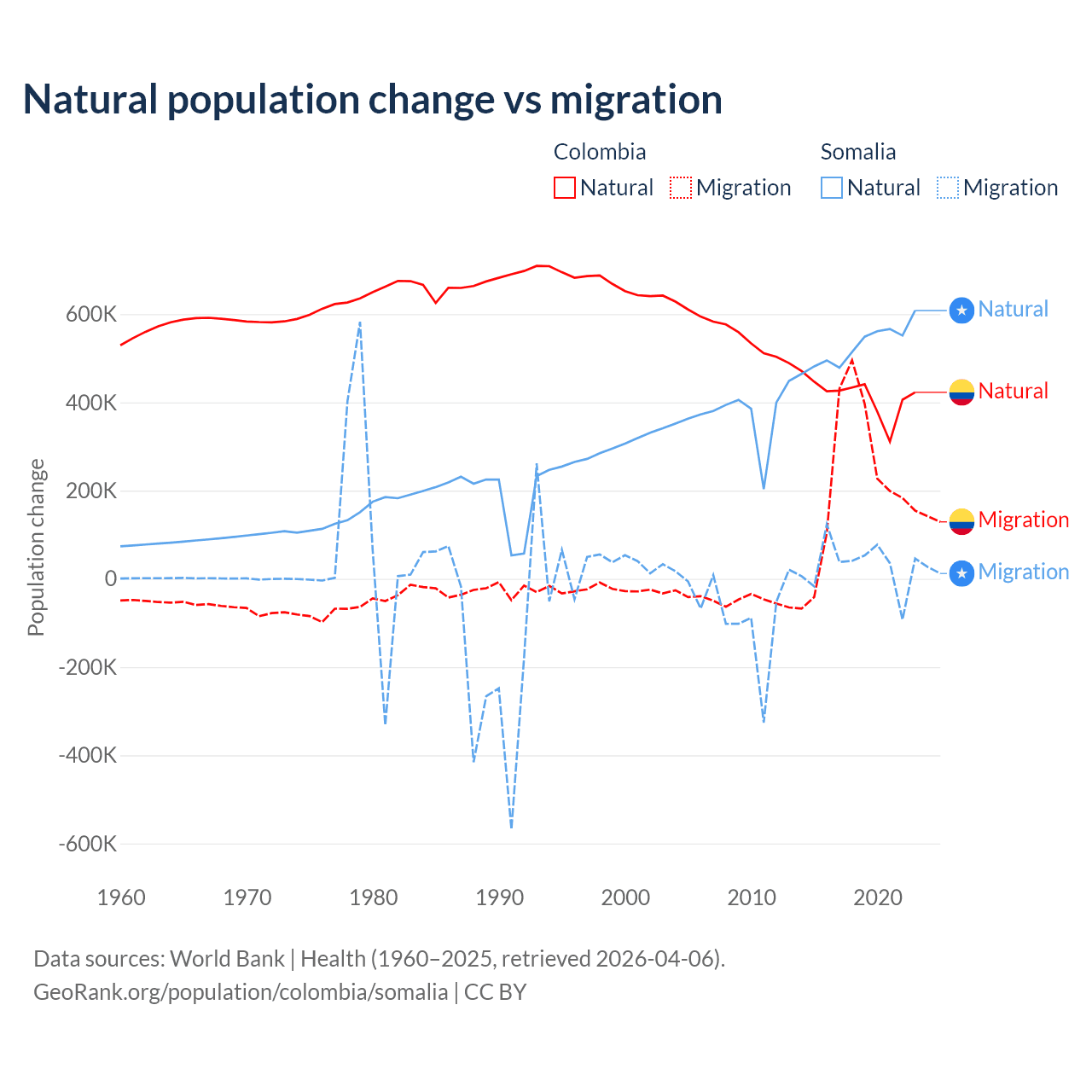 Over the last 10 years, 66.6% of the population change in Colombia is from natural causes (a gain of 4,162,856 people) and 33.4% is from migration (a gain of 2,083,051 people). In Somalia 94.4% is from natural causes (a gain of 5,270,105 people) and 5.58% is from migration (a gain of 311,487 people).