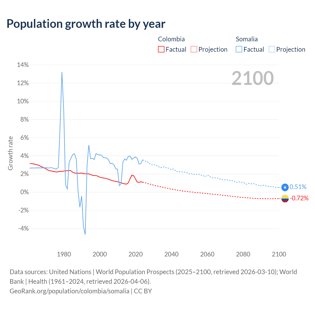 - For the last 10 years, Colombia has had an average growth rate of +1.25% per year vs +3.61% in Somalia.