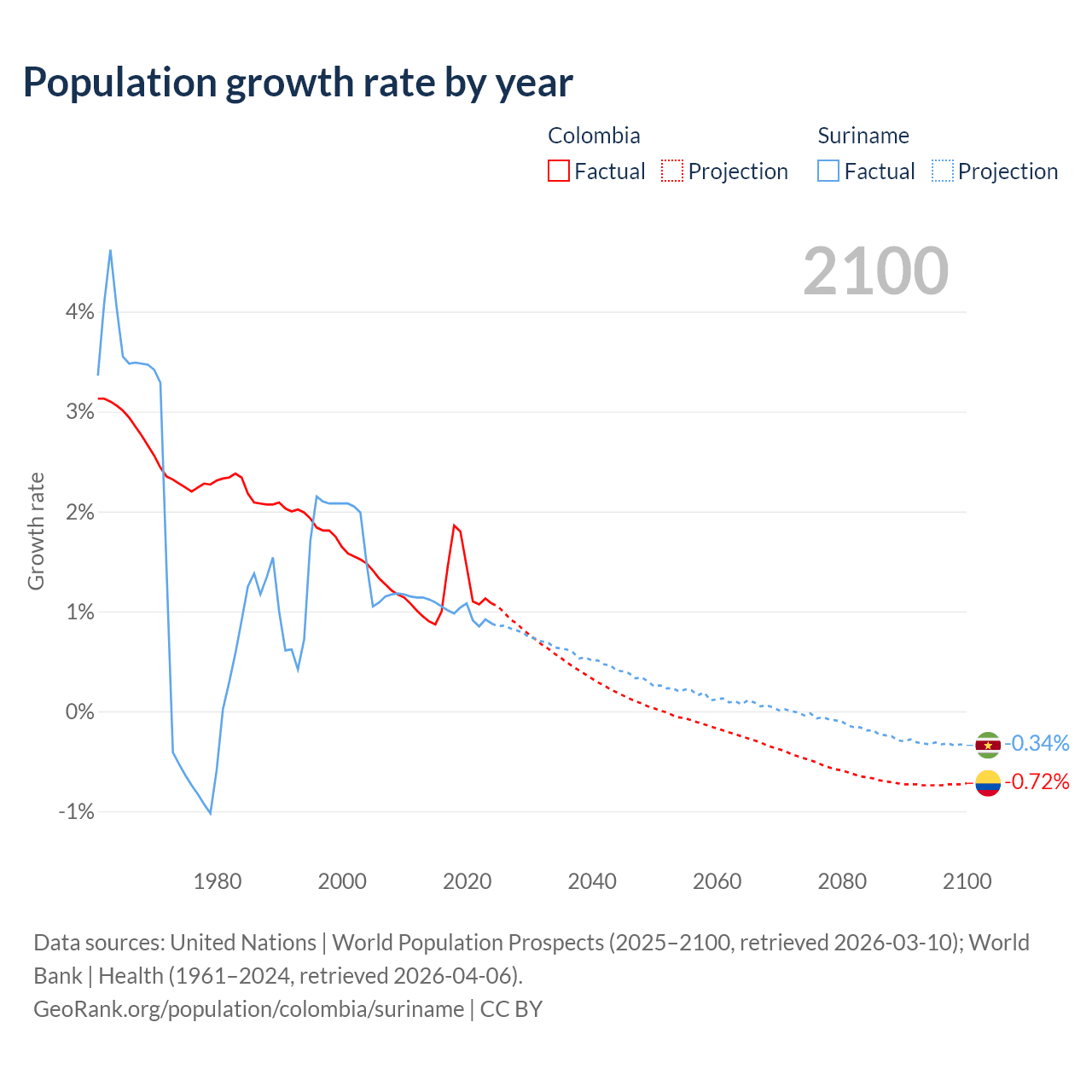 - For the last 10 years, Colombia has had an average growth rate of +1.25% per year vs +0.99% in Suriname.