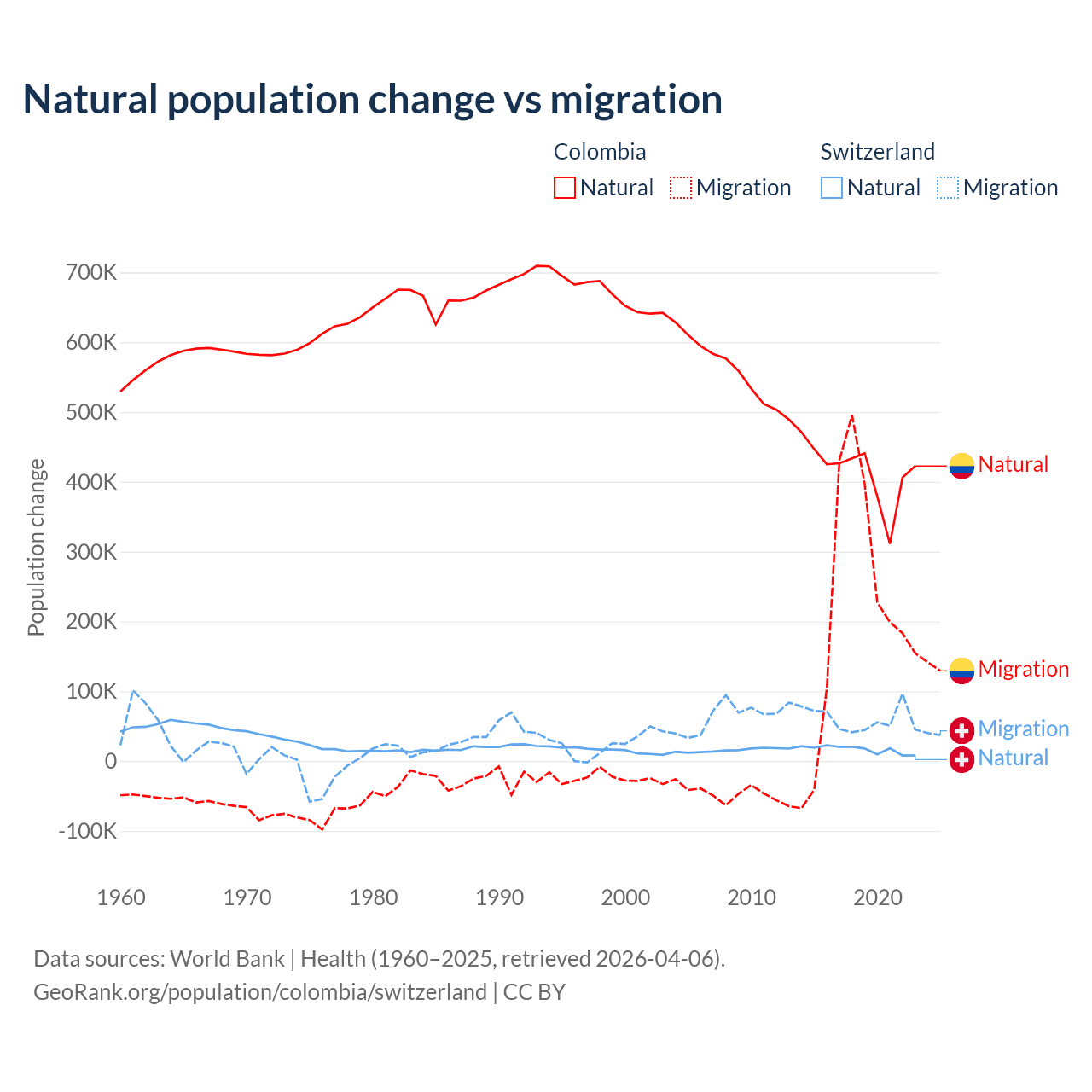 Over the last 10 years, 66.6% of the population change in Colombia is from natural causes (a gain of 4,162,856 people) and 33.4% is from migration (a gain of 2,083,051 people). In Switzerland 21.6% is from natural causes (a gain of 165,354 people) and 78.4% is from migration (a gain of 600,145 people).
